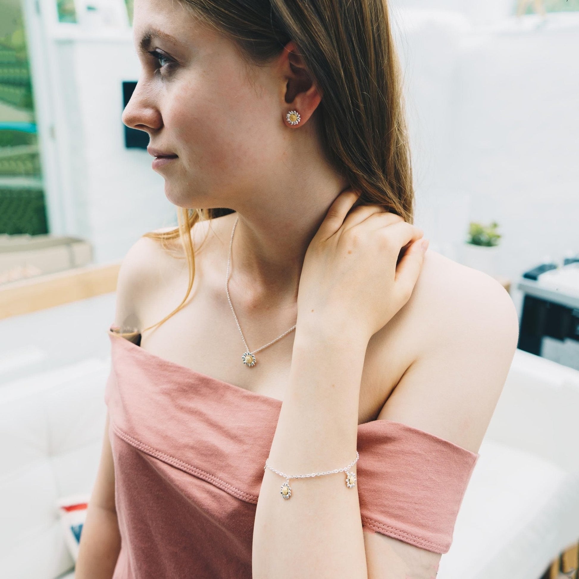 This 3pc Daisy Bracelet Set from Philip Jones is the perfect addition to any jewellery collection. Crafted from luxury gold and silver plated brass alloy, the set features a stud earring pair, a pendant necklace, and a charm bracelet. Specifications include 9.5mm (H) x 9.5mm (W) earrings, 13mm (H) x 13mm (W) necklace, and 10mm (H) x 10mm (W) charm bracelet, all with a combined total weight of 8.3g.