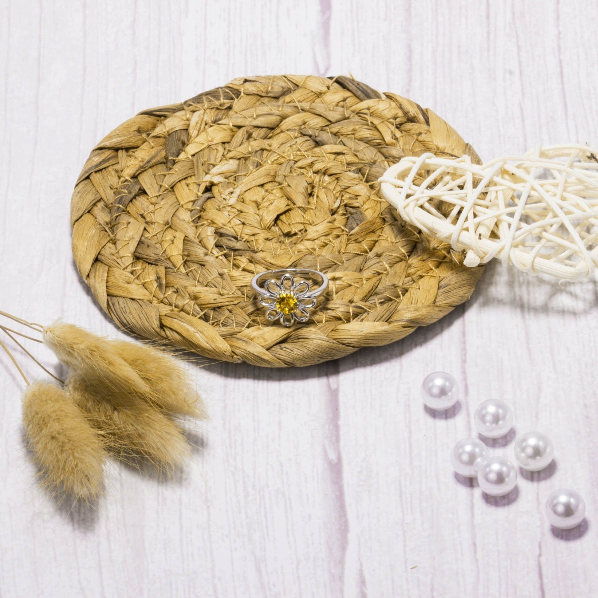 This Philip Jones creation is a stunning adjustable daisy ring featuring a 5mm yellow crystal from Zircondia® mounted to a 2mm silver plated brass alloy band. The delicate yet eye-catching flower measures 15mm (H) x 15mm (W). The ring adjusts from 16.8mm (M) to 18.4mm (Q) and weighs 2.1g.