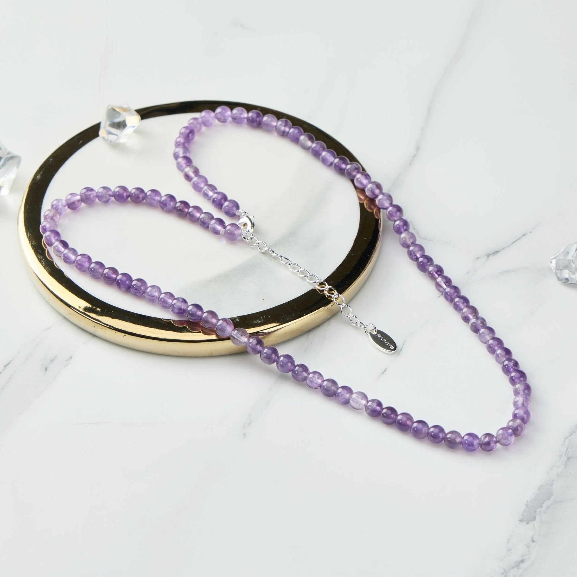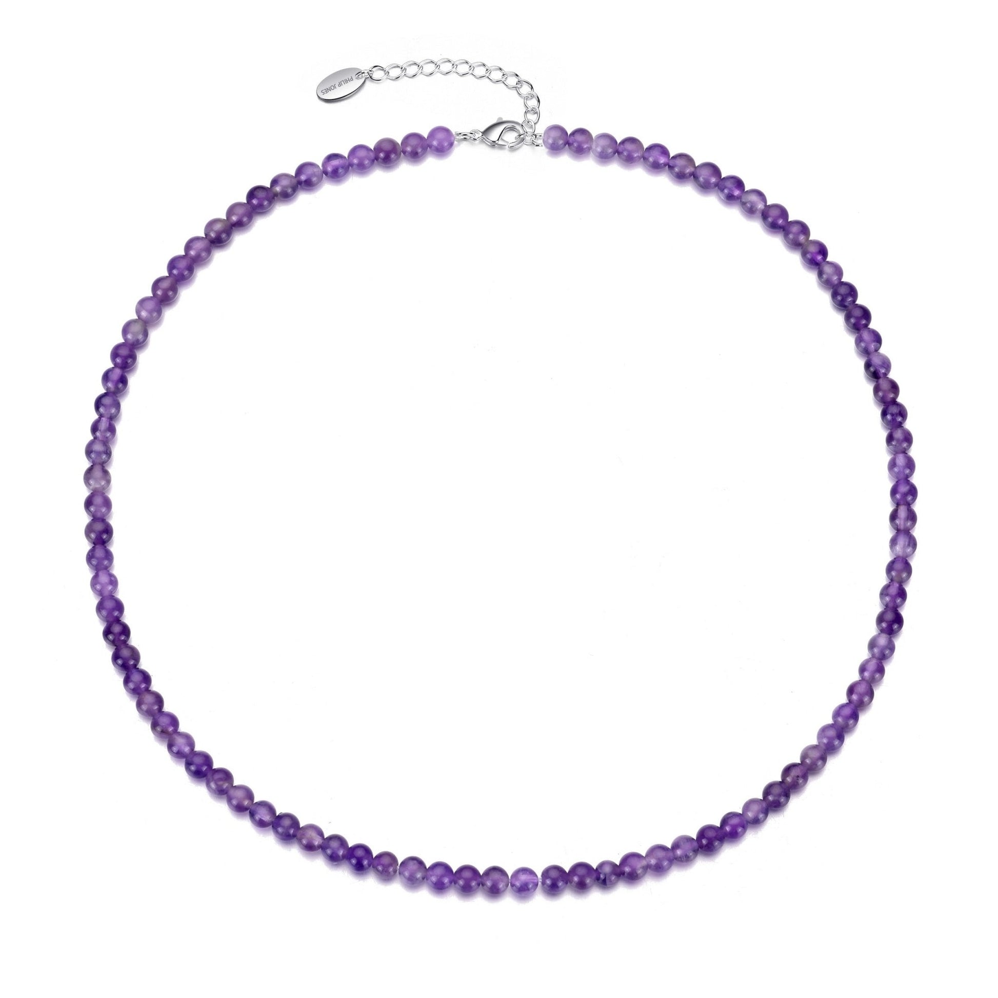 Experience the luxurious combination of silver plated brass and genuine purple amethyst gemstones with this Philip Jones beaded necklace. With a high polished finish and a length of 43cm + 5cm extender, this necklace weighs 14.88g and features 90 round 4-5mm amethyst stones for a stunning pop of colour. Packaged in a 9cm x 10cm gift pouch, it's the perfect present for anyone who appreciates high quality and elegance.