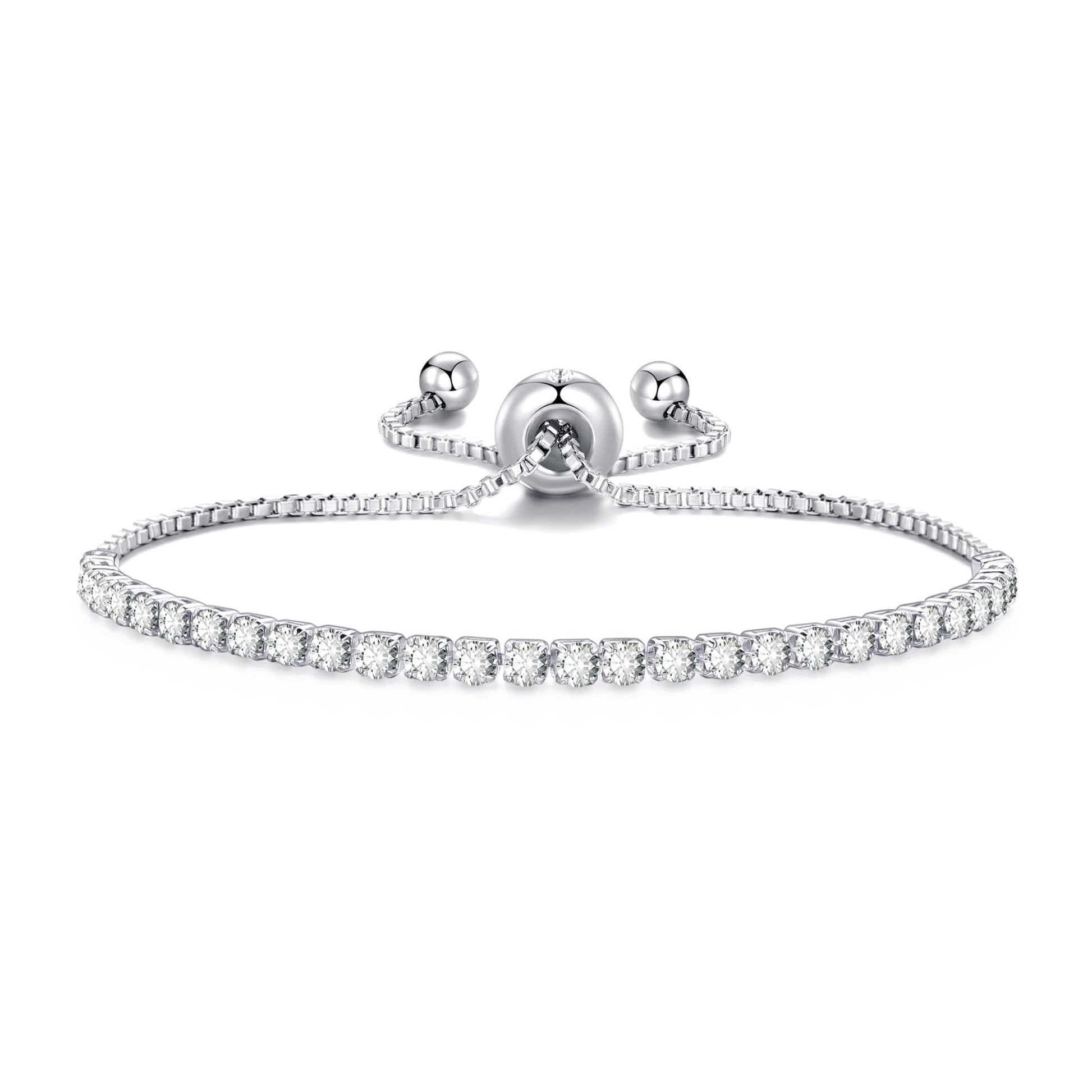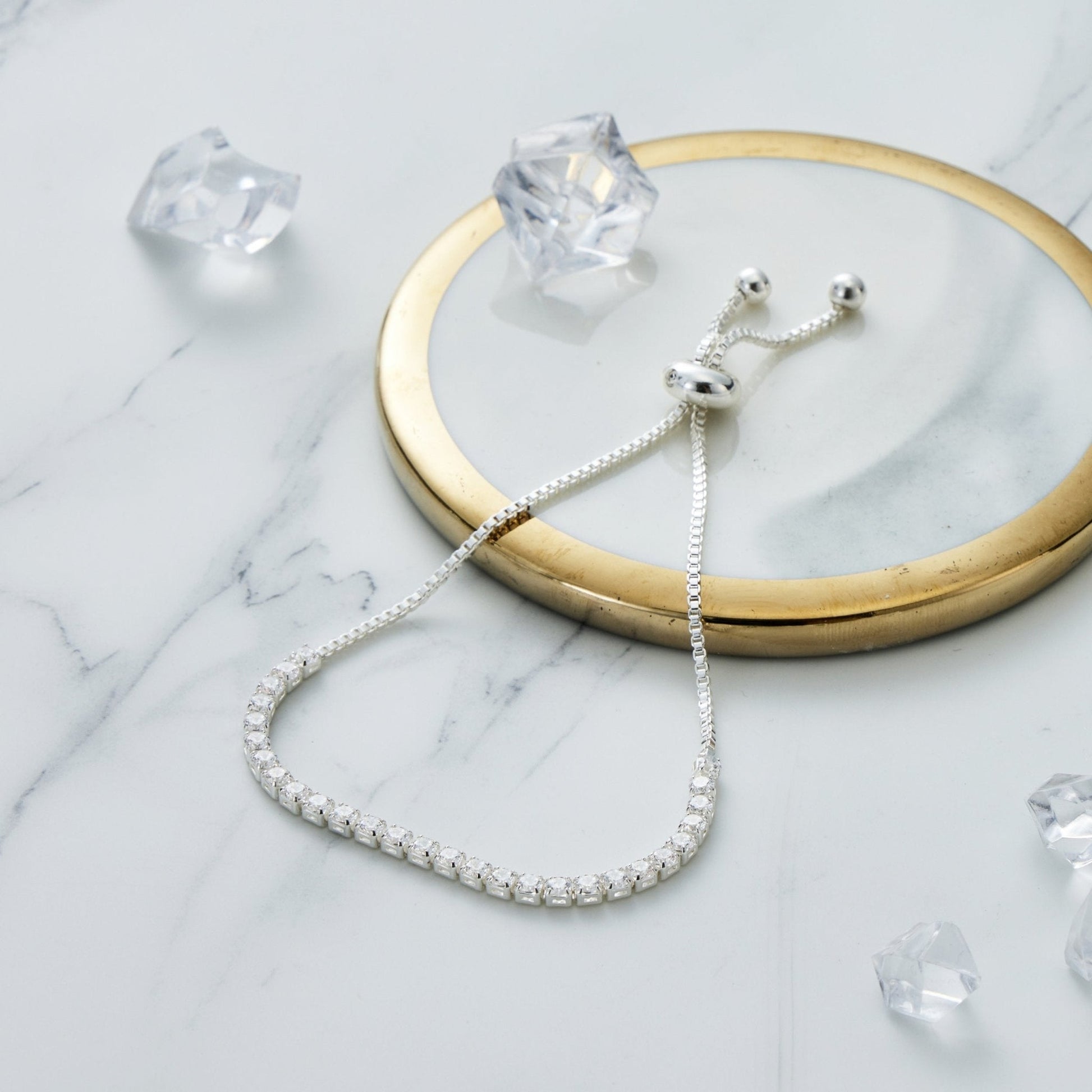 This stunning bracelet features Zircondia® Crystals in a silver plated hypoallergenic design. The brand, Philip Jones, is known for its high-quality jewelry made with brass alloy. This adjustable tennis bracelet has a slider closure and weighs 6.02g. With 28 round clear crystals, each measuring 3mm, it comes in a gift pouch with a quote card, measuring 10cm x 9cm.