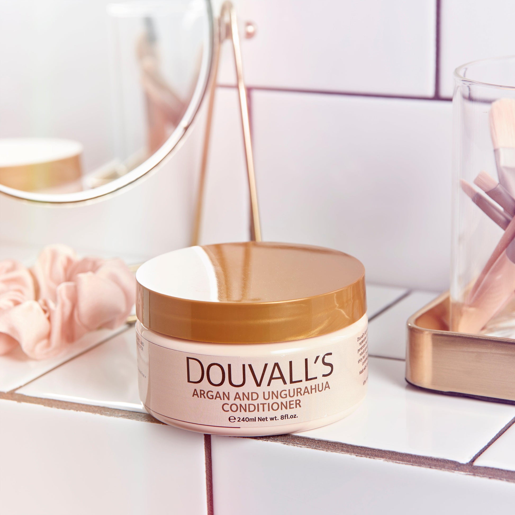 Douvall’s ultra nourishing Conditioning treatment is ideal for all types of hair including Afro, dry, Curly ,and treated, with this rich and repairing, formula of our Organic First cold pressed Argan oil and Ungurahua oil rich in Vitamin E, anti oxidants, omega 3,6,9, along with fatty acids, and infused with exotic extracts of Coconut, Lavender, Sage, Jasmin and Ylang Ylang for detangling, and strengthening to maintain strong healthy hair and scalp.