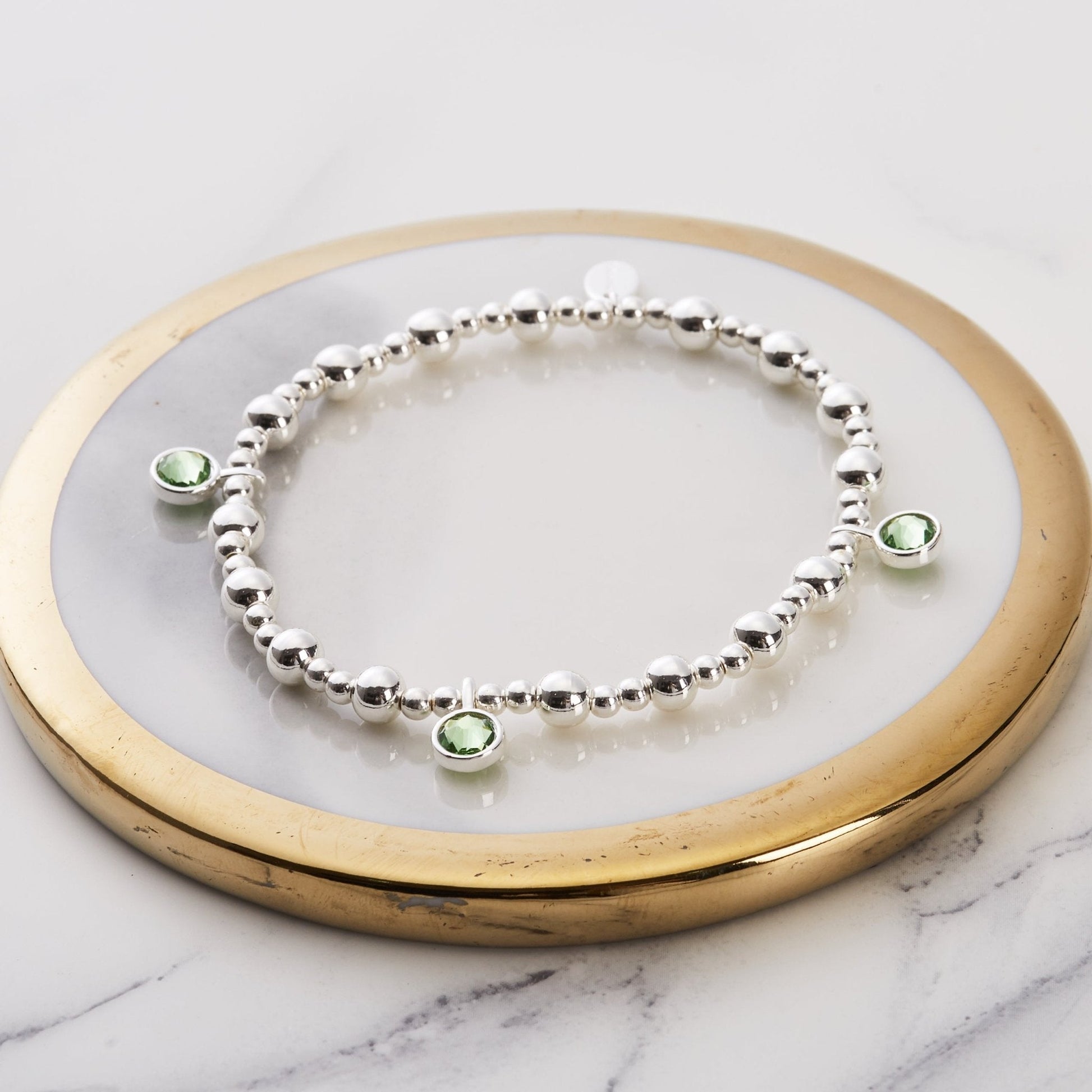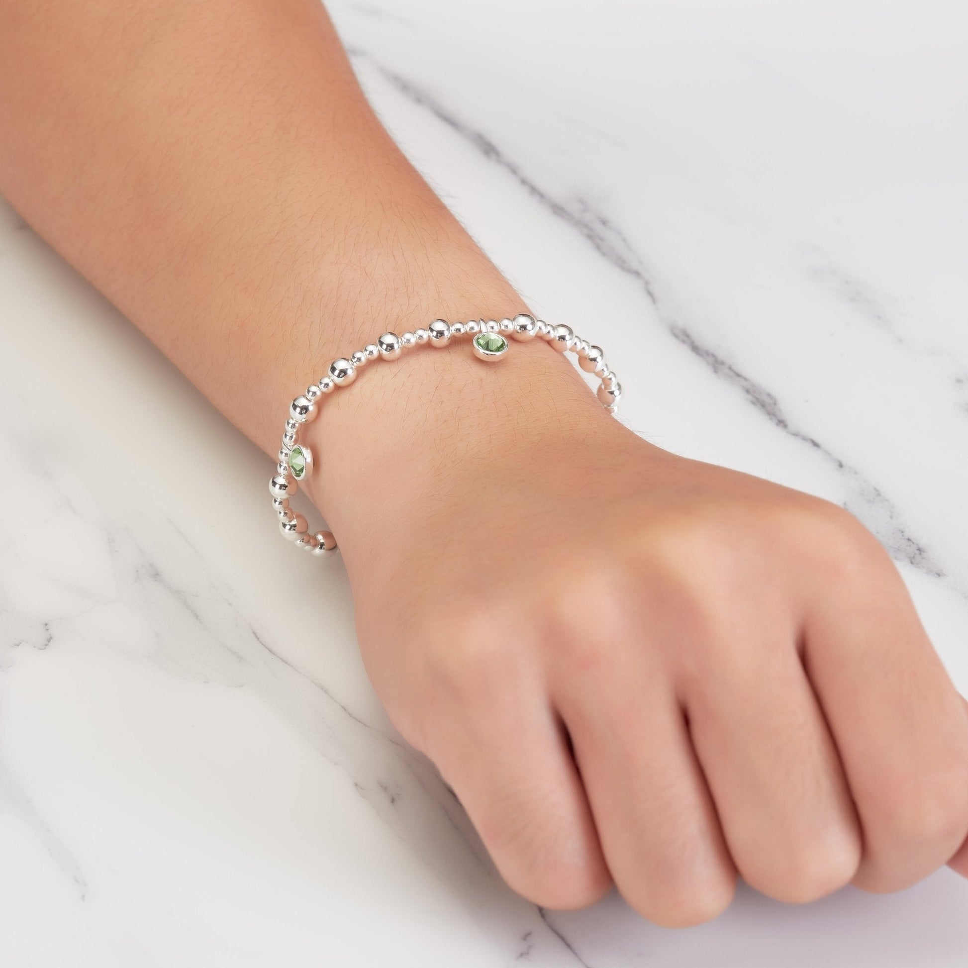 Adorn yourself with beauty, elegance, and good luck with the August (Peridot) Birthstone Stretch Charm Bracelet. Silver plated with hypoallergenic and durable Zircondia® crystals, this stunning piece is perfect for any stylish occasion. Wear it alone or stack it with other pieces to manifest your best and brightest.