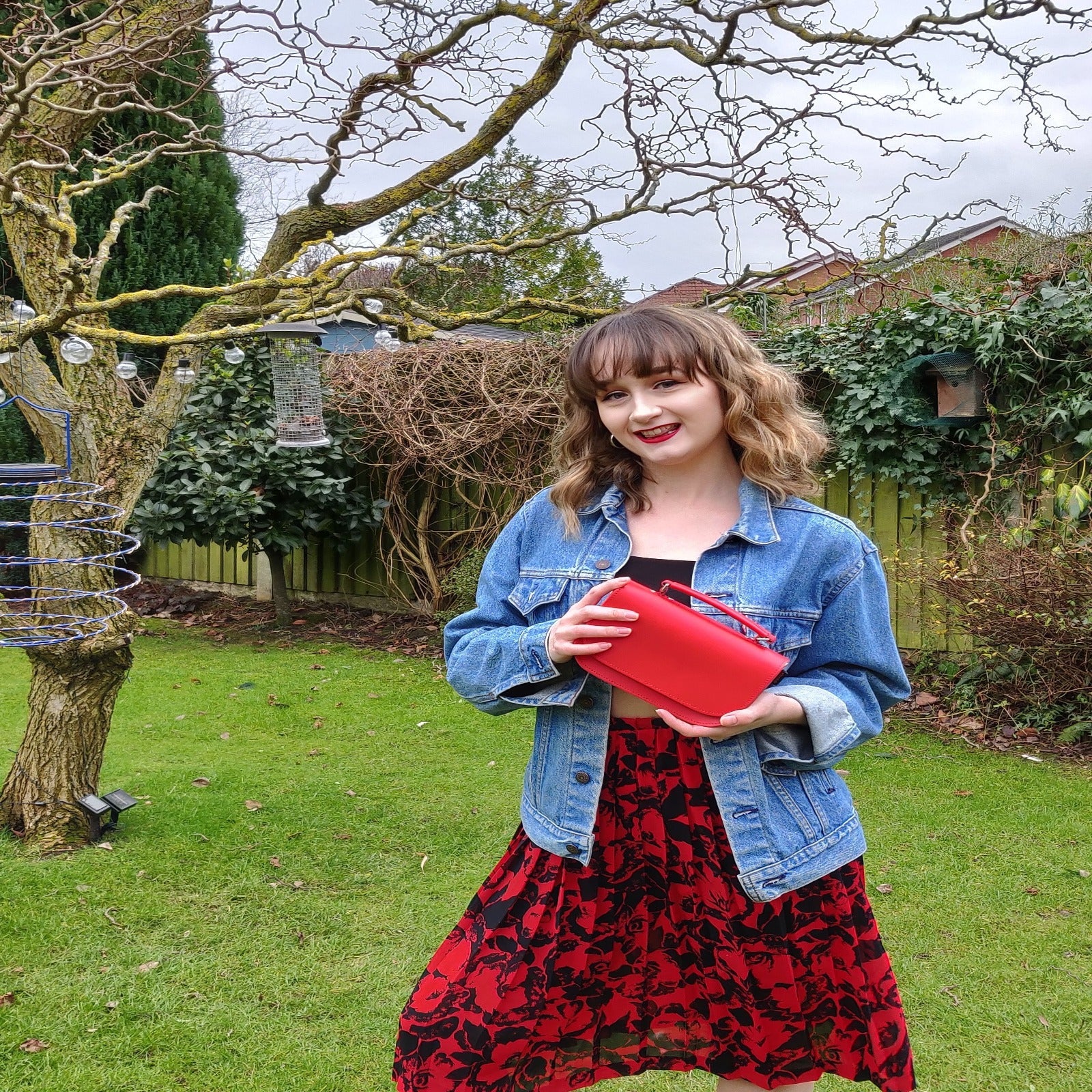 Model carries the Pillar Box Red Aura & example of what fits shows the Black Aura with a small purse, lipstick, gum, mobile phone.