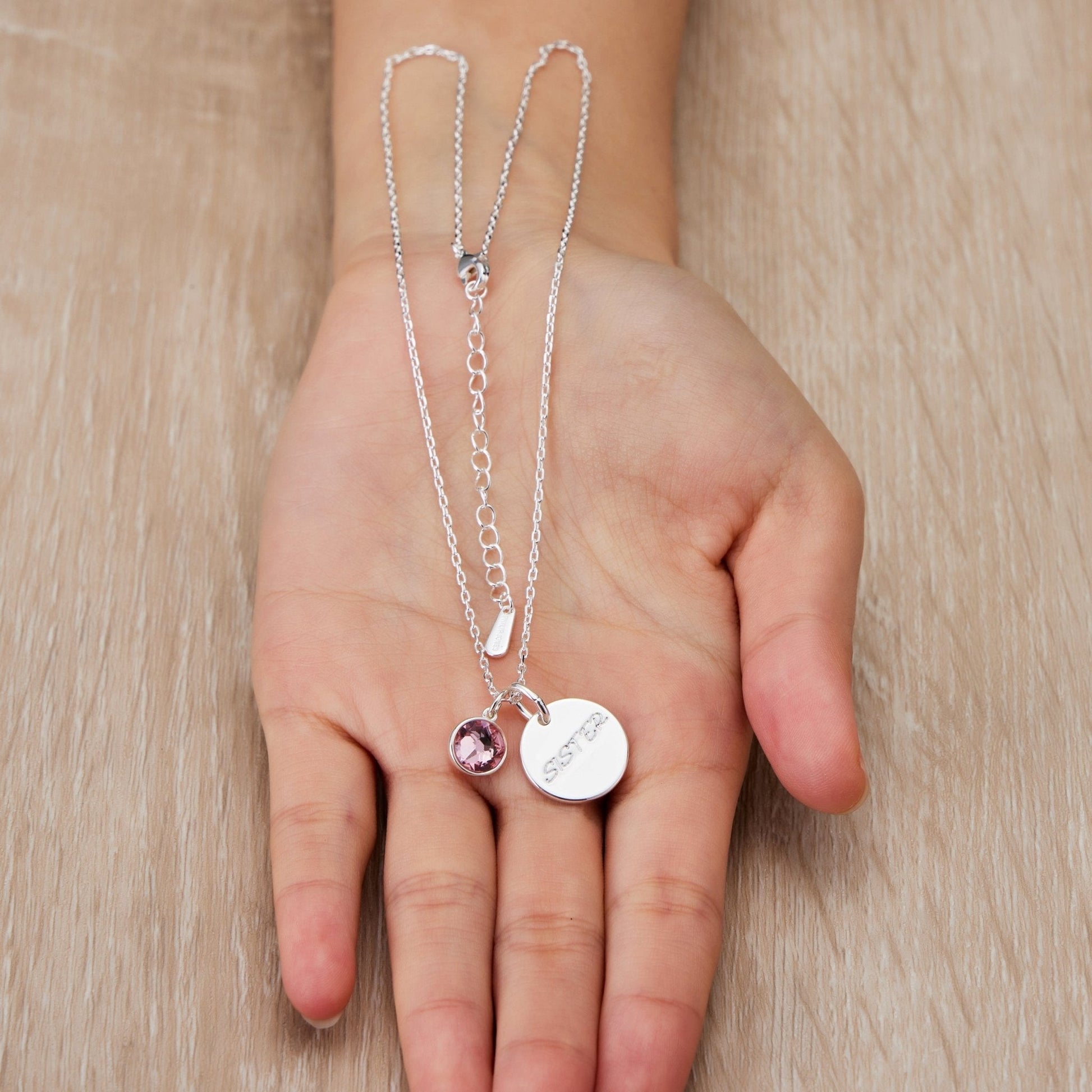 Celebrate a special sister bond with the Philip Jones Sister Birthstone Necklace. Crafted from durable silver-plated brass alloy and featuring shimmering Zircondia® crystals, this pendant-style necklace has a 14mm (H) x 8.5mm (W) pendant and a 43cm + 5cm extender chain for a perfect fit. Its lobster claw closure ensures a secure wear, and its 2.58g initial pendant make it a timeless accessory.