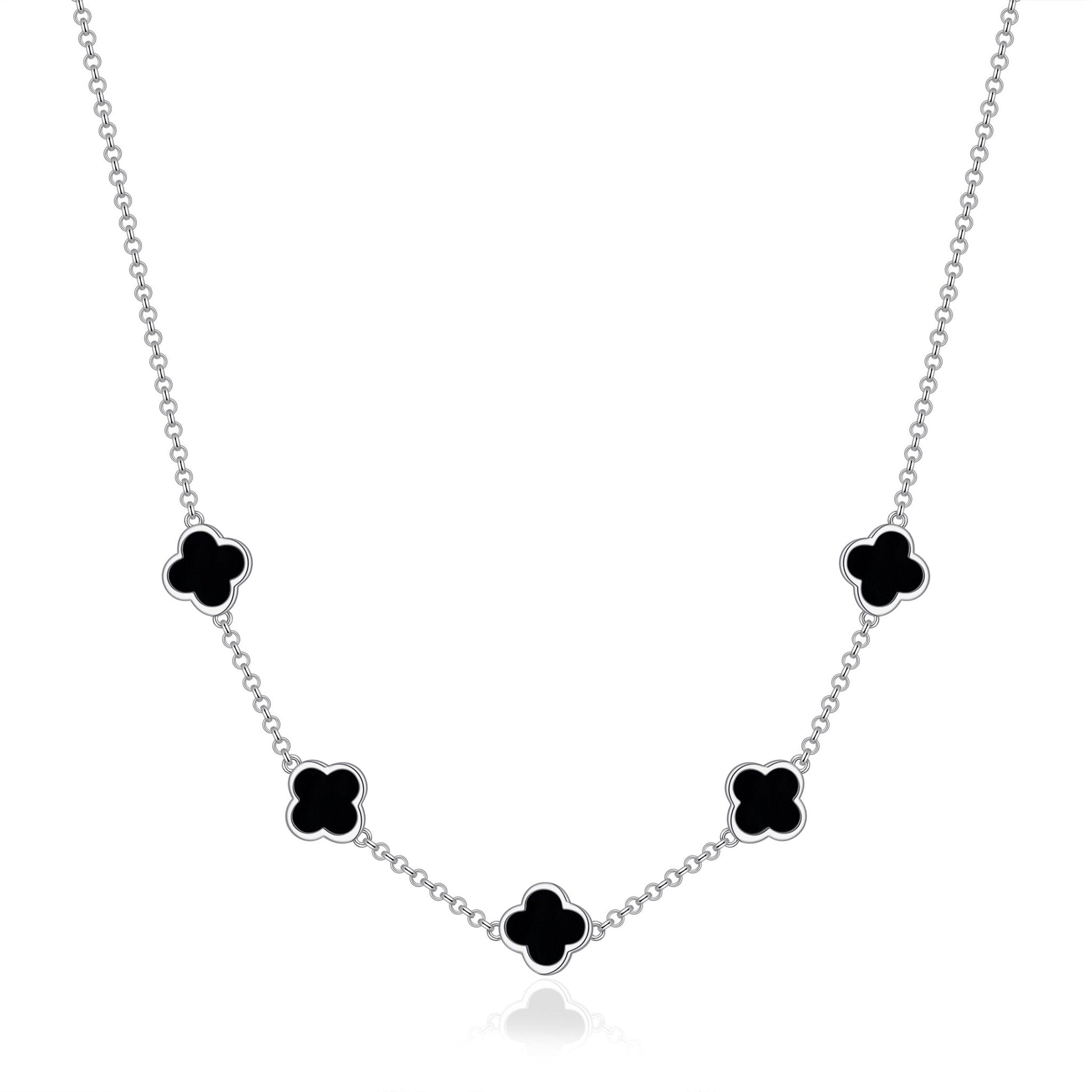Experience the beauty of our Black Onyx Multi Clover Necklace from Philip Jones. Crafted with silver plating and a hypoallergenic base metal, this pendant necklace features a stunning black stones in the shape of a clover. The 5 pendants measures 9.5mm and hangs on a 43cm chain with a 5cm extender. This gorgeous piece comes packaged in a convenient gift pouch.