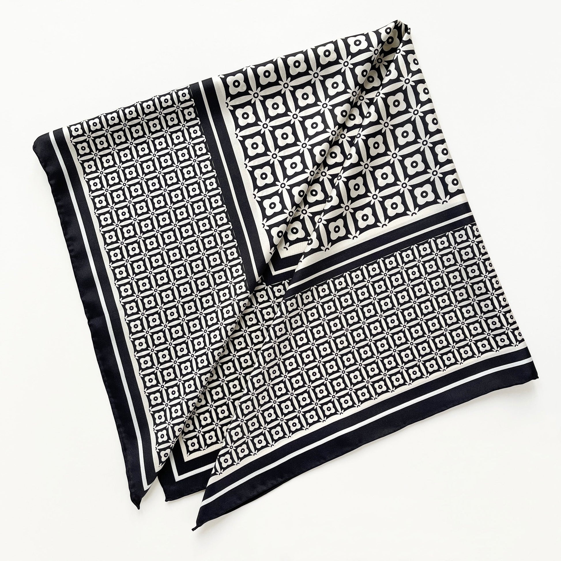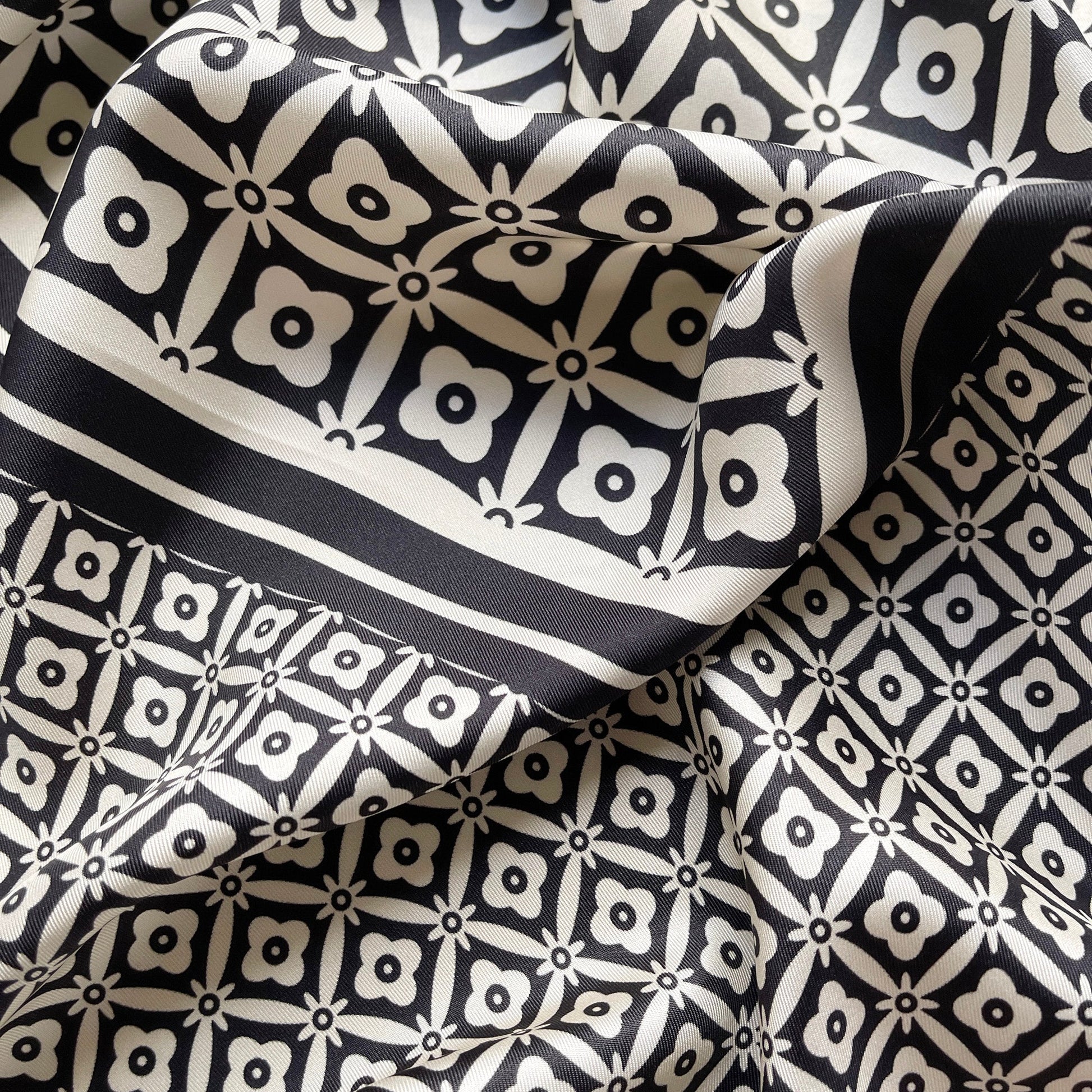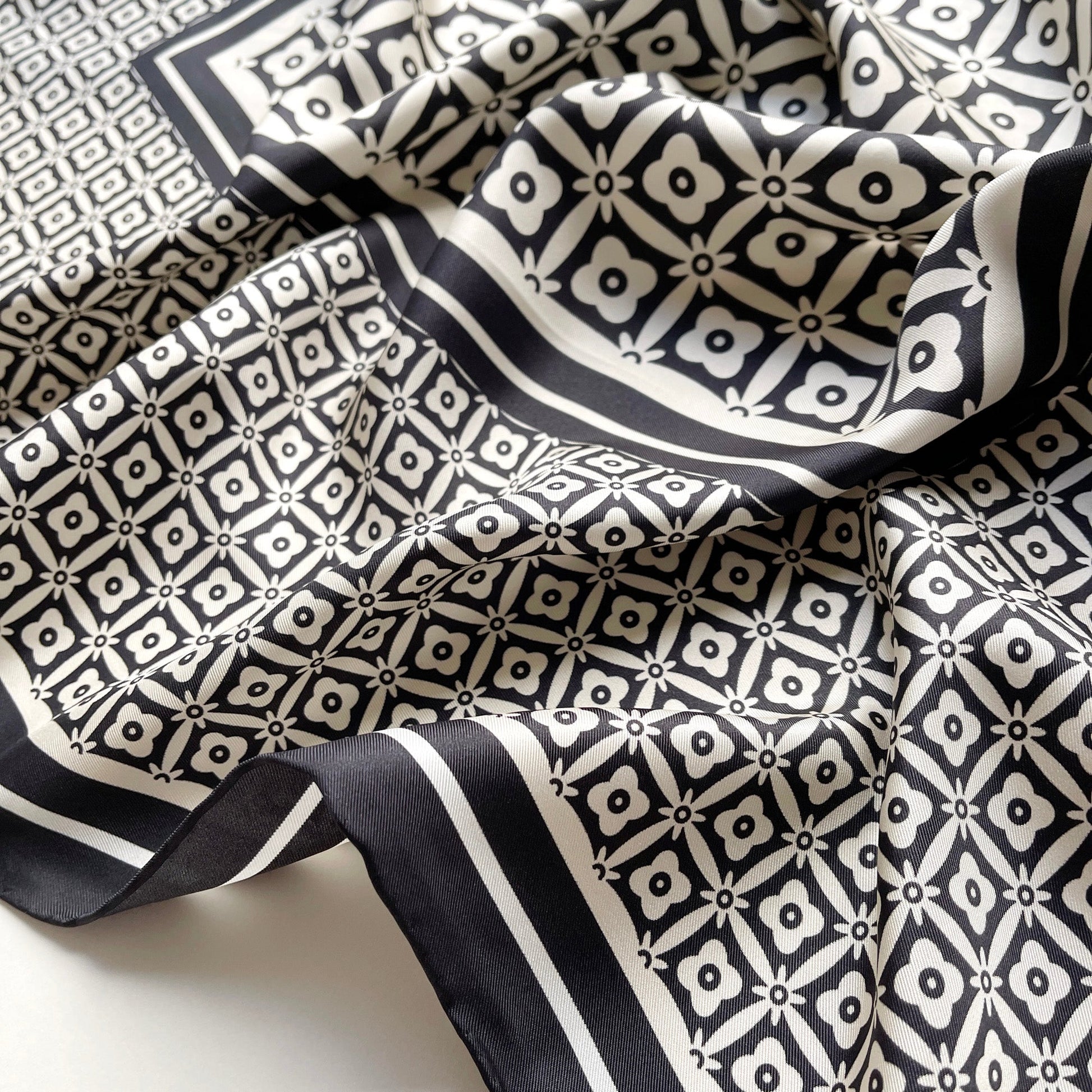 Indulge in timeless sophistication with this luxurious 90x90cm silk scarf, featuring a striking black and white geometric floral pattern. Crafted from premium silk, it is lightweight yet durable, offering a soft, smooth texture that feels divine against your skin.