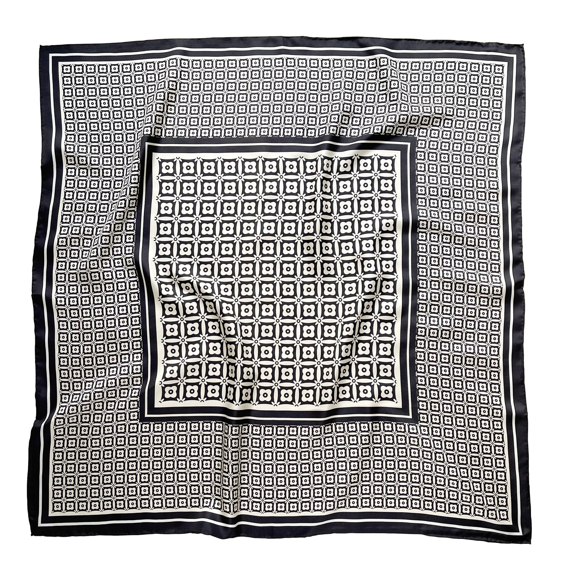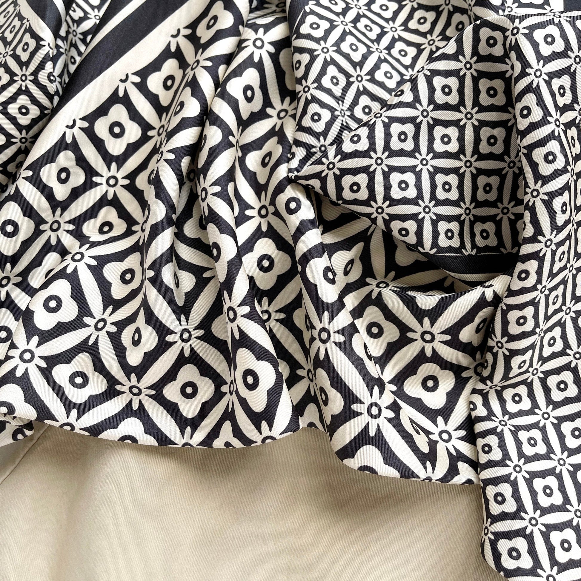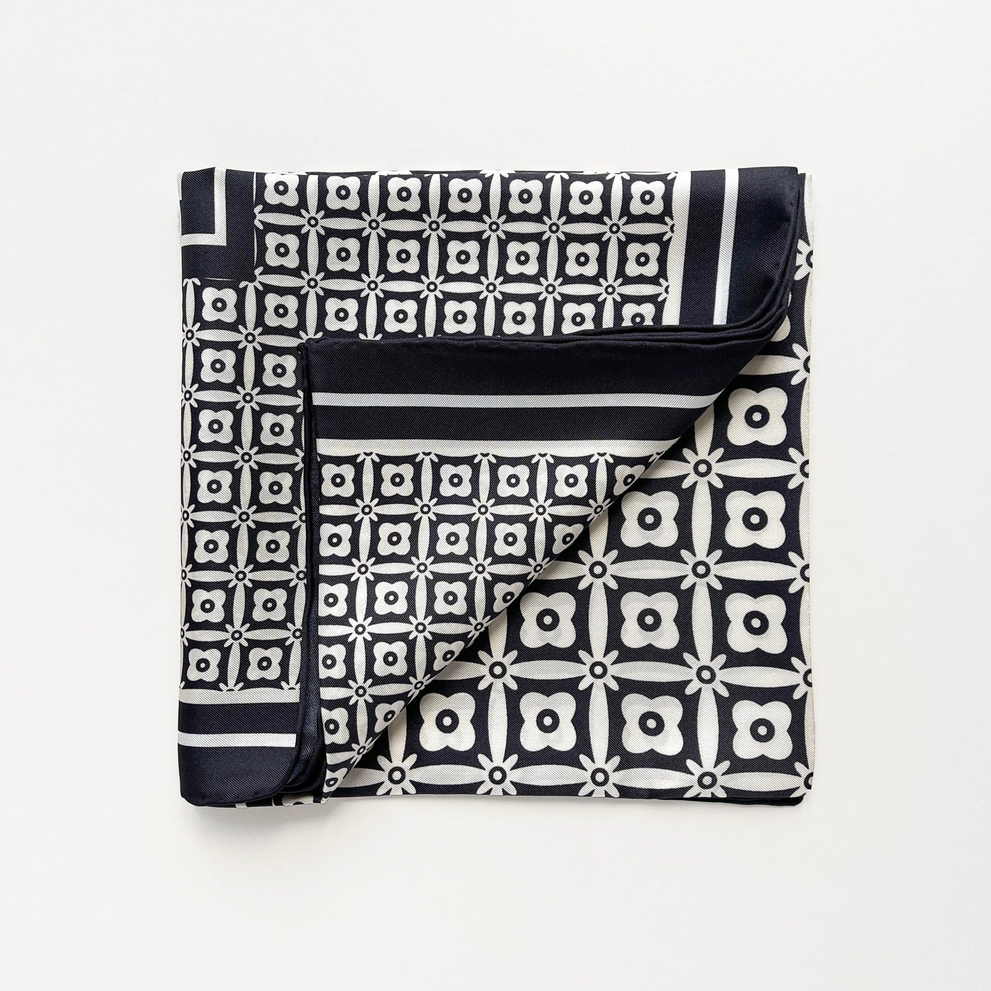 Indulge in timeless sophistication with this luxurious 90x90cm silk scarf, featuring a striking black and white geometric floral pattern. Crafted from premium silk, it is lightweight yet durable, offering a soft, smooth texture that feels divine against your skin.