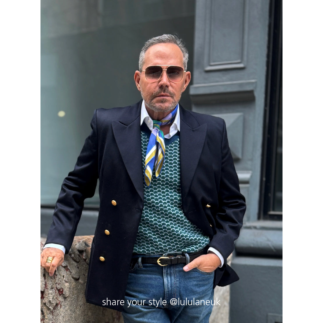 Elevate your style with our Abstract Lotus Print Silk Scarf. This luxurious square scarf, featuring hand-rolled hems, combines elegance with vibrant hues of blue, green, lilac, and mustard yellow. Crafted for both women and men, it offers versatile styling as a neckerchief, bandana, or head scarf. Perfect for adding a sophisticated touch to any outfit, whether paired with denim or dressed up with white, blue, or beige. This silk scarf is a must-have accessory for your year-round wardrobe.