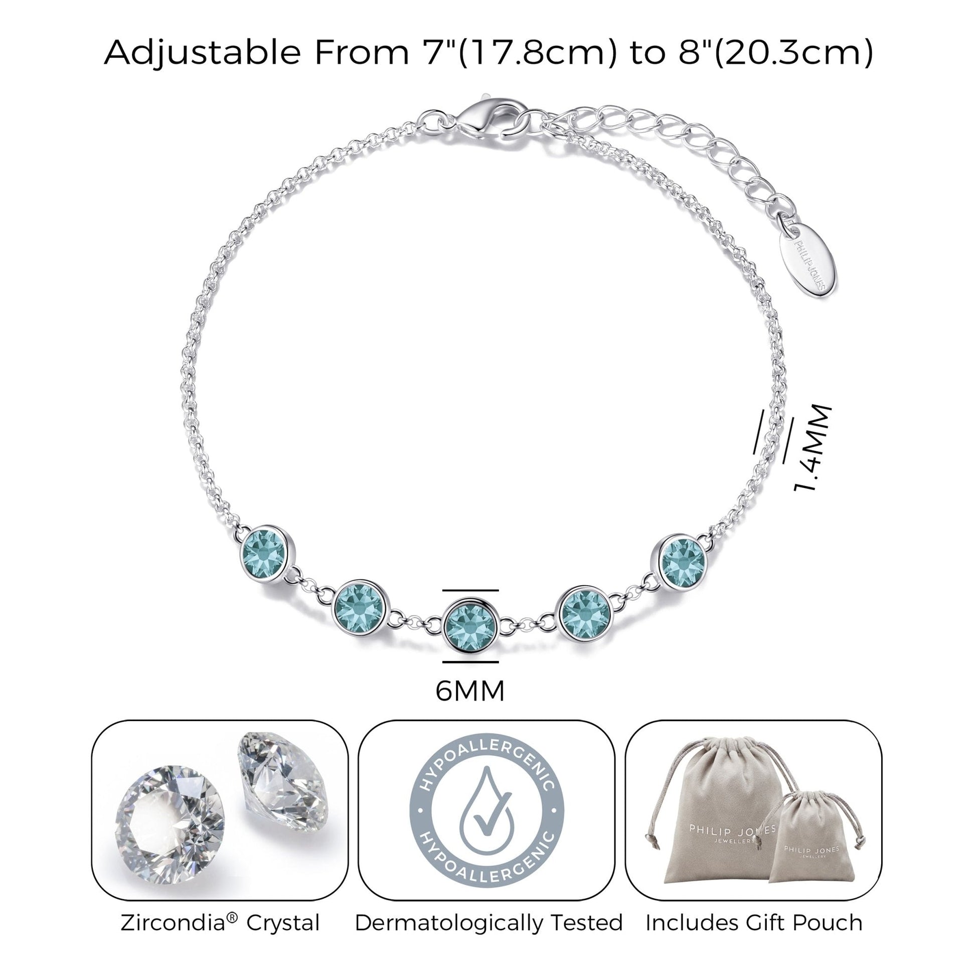 This stylish Blue Crystal Chain Bracelet is crafted from silver-plated brass alloy, with a cable chain measuring 18cm plus a 2.5cm extender. It features 5 Zircondia® Crystals in a round shape and 4mm size, elegantly connected with a lobster claw closure. Lightweight at only 3.5g, it's the perfect accessory for any formal occasion.