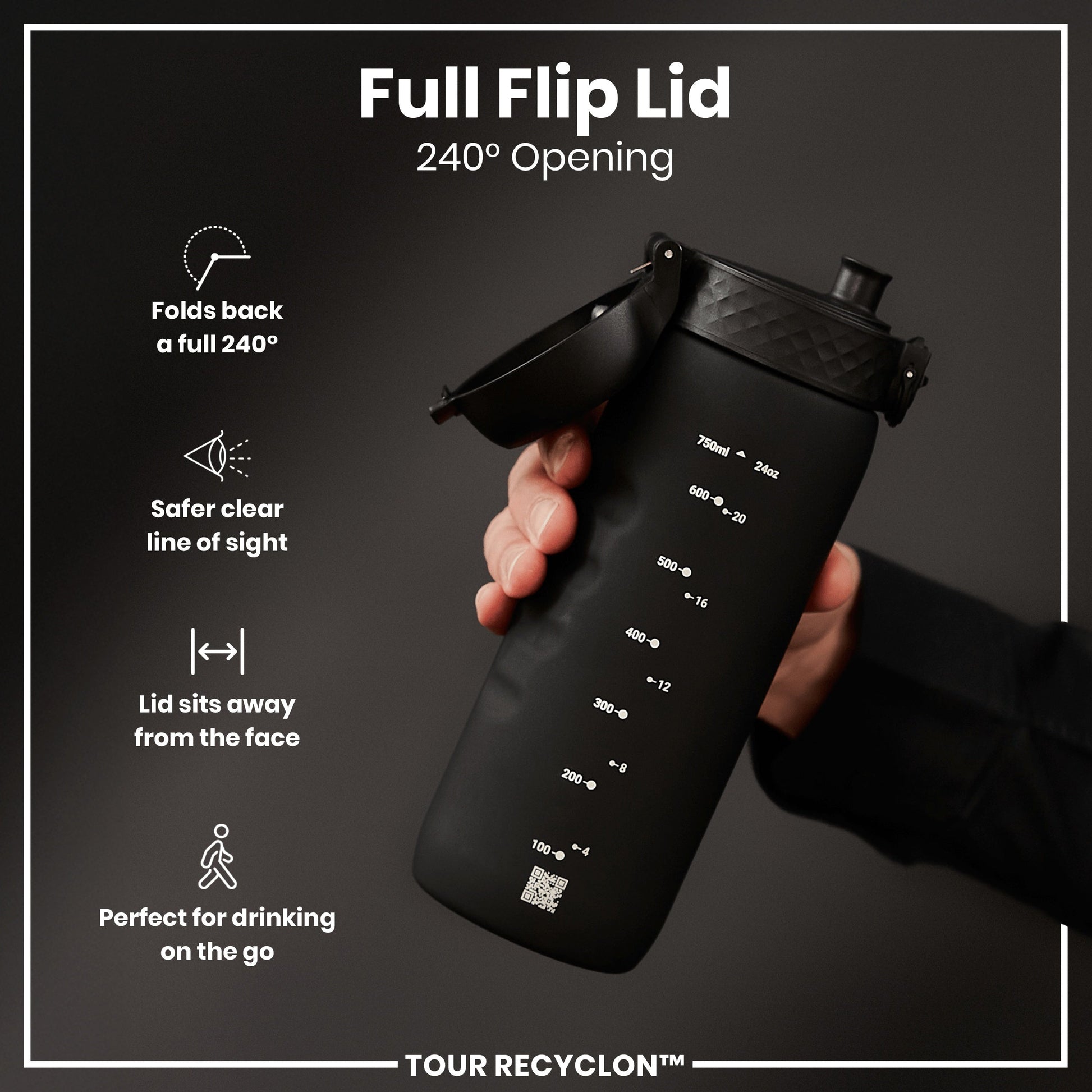 100% leak proof 750ml / 24oz BPA free sport black water bottles with a smooth flow for spill-free hydration and hygienic full-flip top cover for one handed use on-the-go.