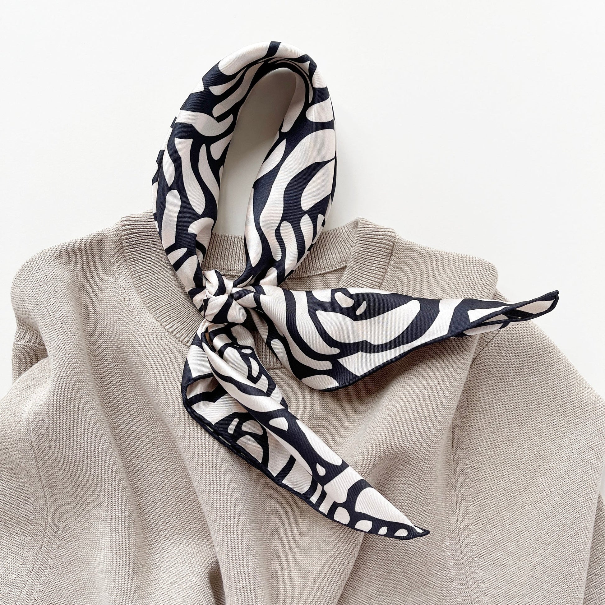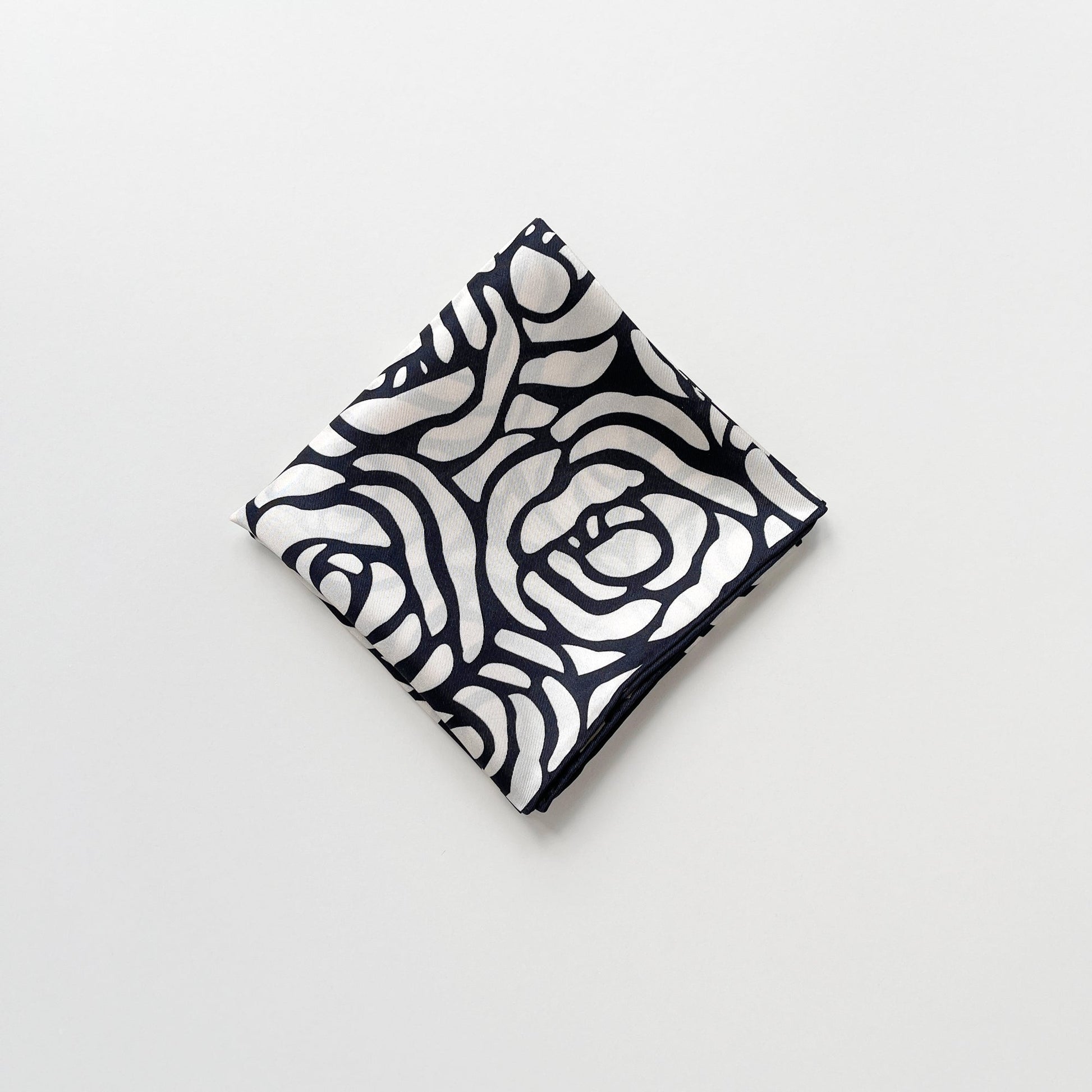 Enhance your style with our luxurious women's silk square scarf, featuring a pristine white base with a charcoal black abstract rose print. This elegant accessory is perfect for both casual and formal occasions. Hand-rolled edges add a refined finish, showcasing exceptional craftsmanship. Elevate your look with this sophisticated silk scarf, ideal for any event or everyday wear.