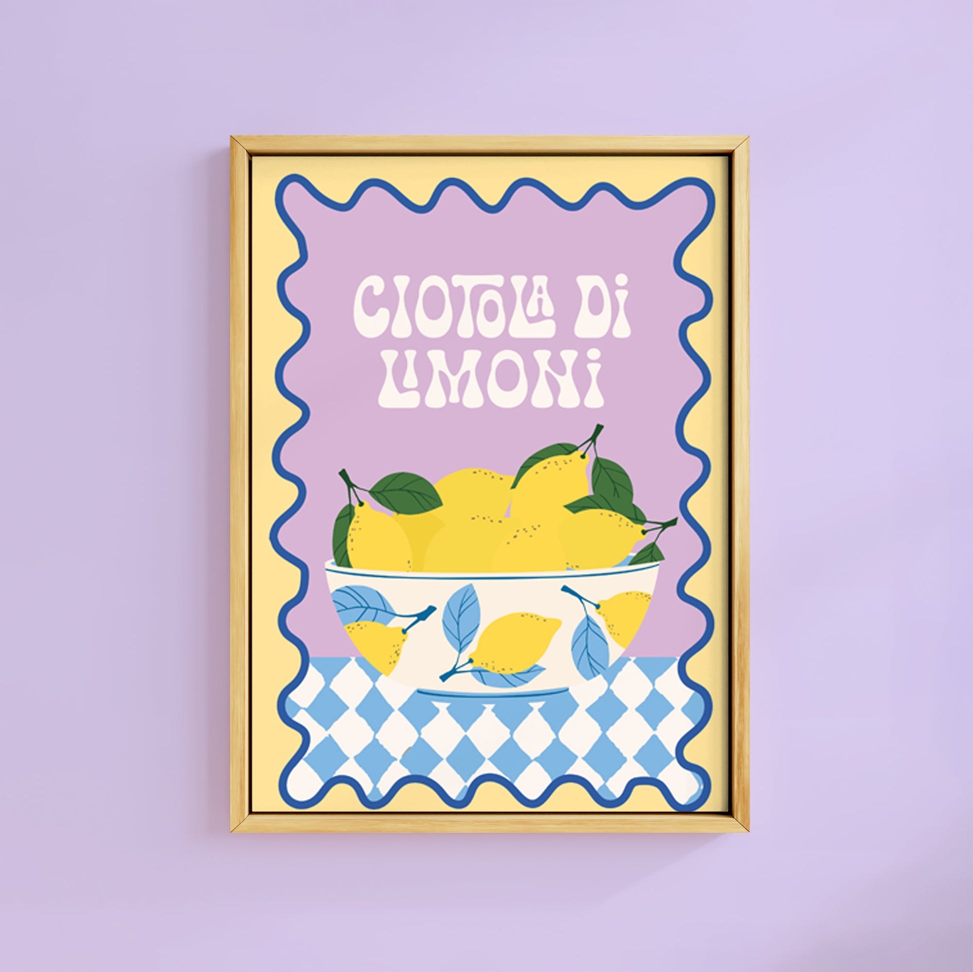 Simply translates to A Bowl of Lemons! A little retro print with a butter yellow and lilac background set in a wavy frame, a bowl of lemons sits on a checkerboard table. A fun take on retro design.
