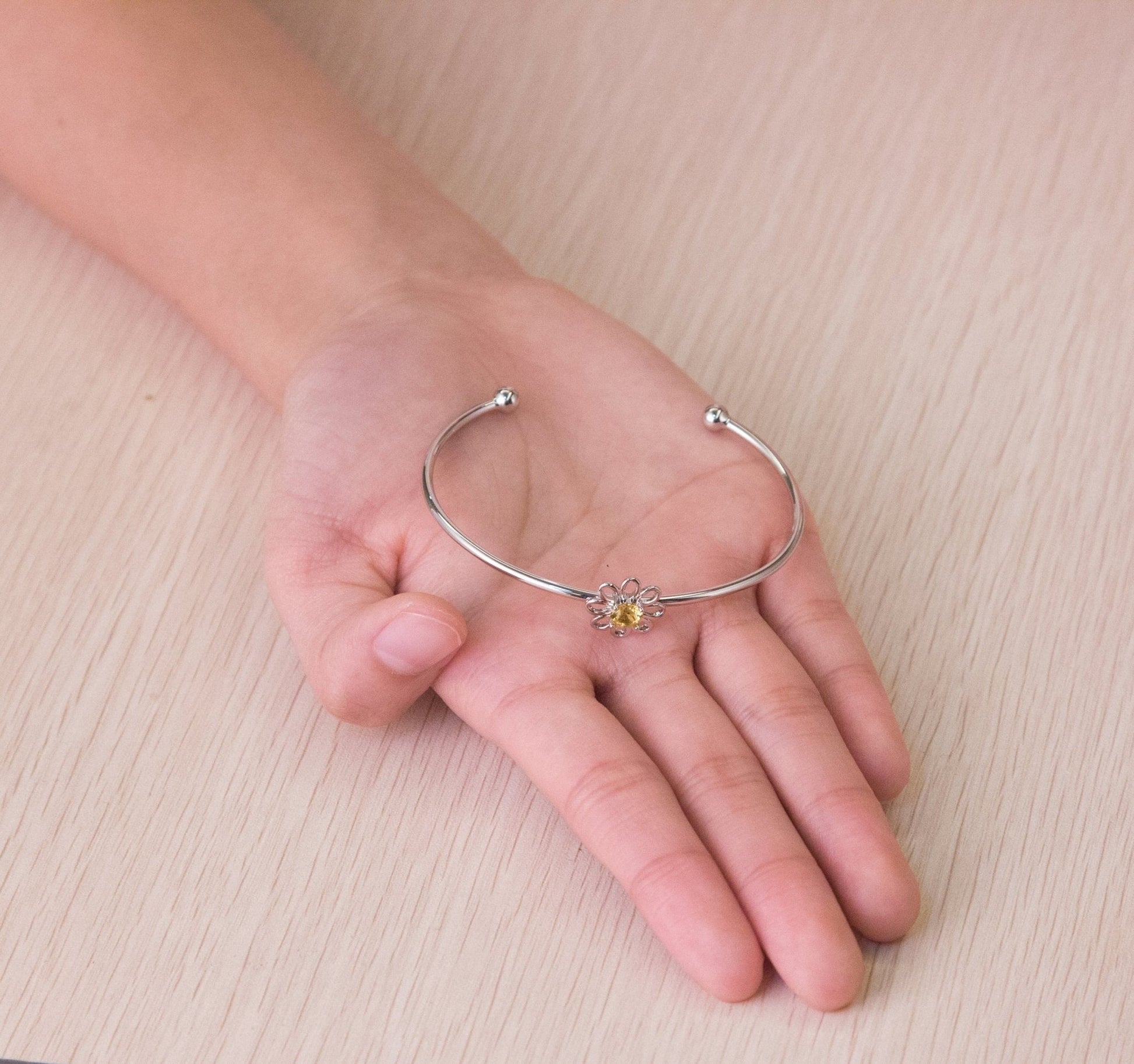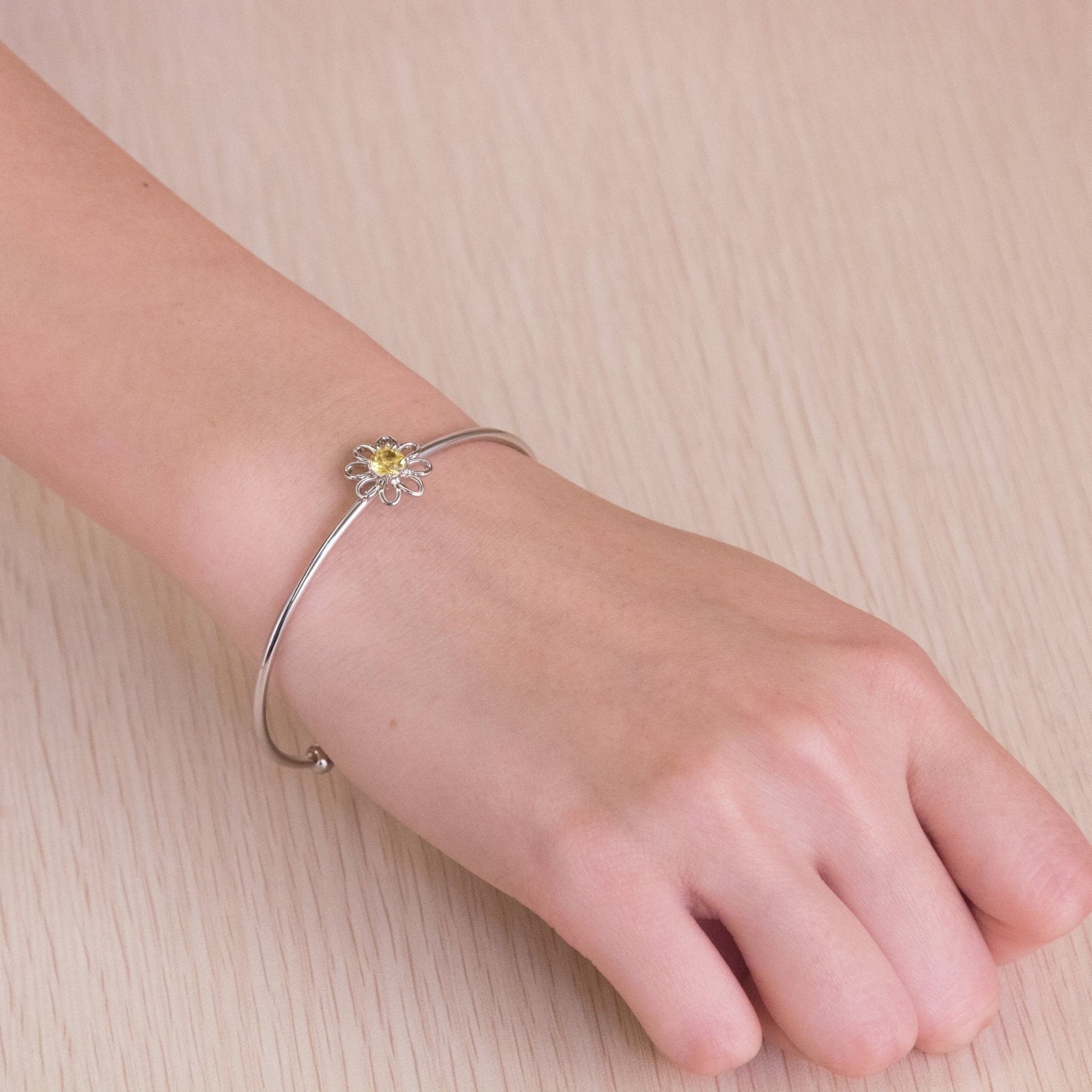 Indulge in the beauty and elegance of the Daisy Crystal Cuff Bangle, crafted with love and care using Zircondia® Crystals. The silver plated bangle is not only hypoallergenic, but also features a charming daisy design with stunning 5mm round yellow crystals. Perfectly packaged in a gift pouch, it's the ideal gift for yourself or a loved one.