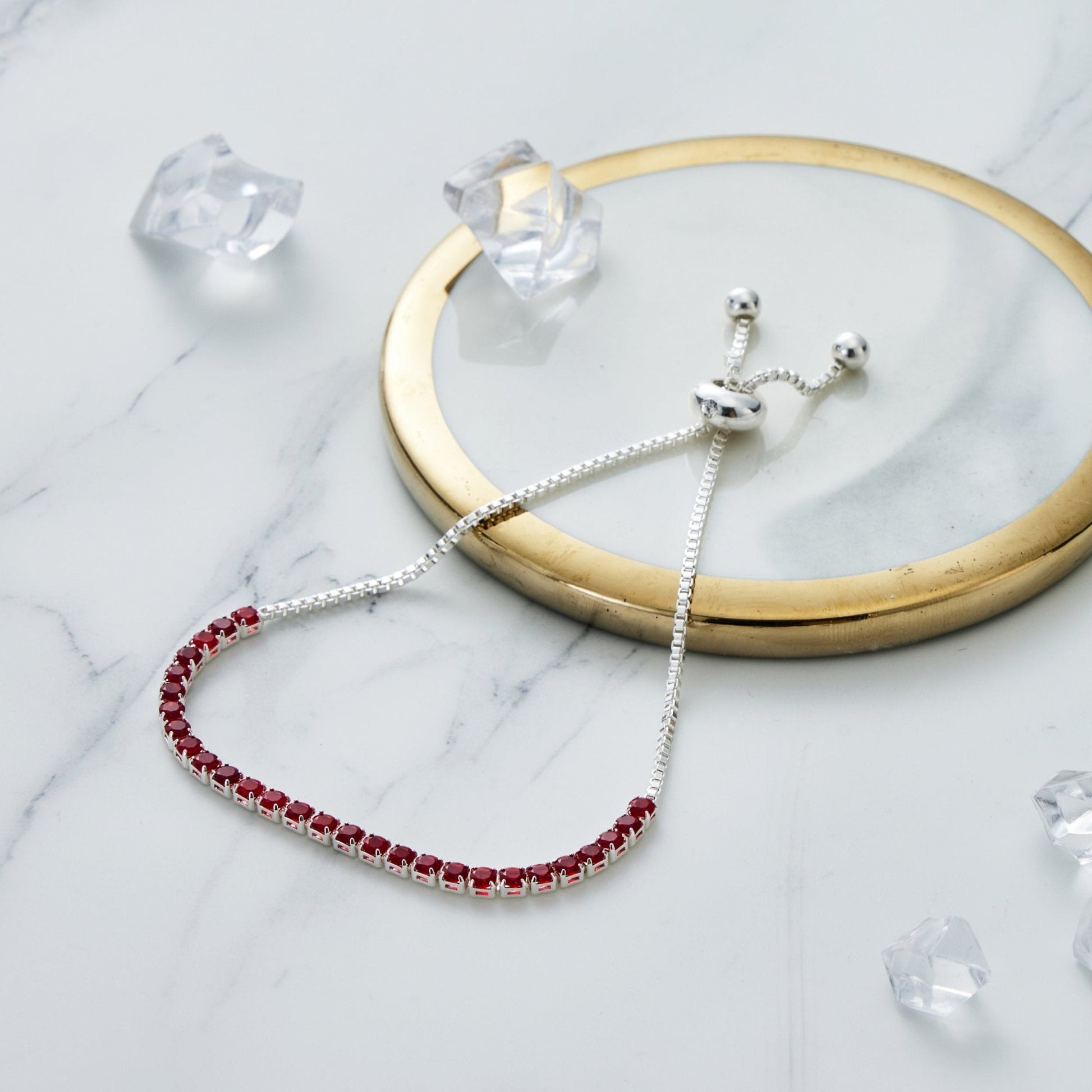 Experience the magic of Dark Red Tennis Friendship Bracelet, adorned with shimmering Zircondia Crystals. Crafted with hypoallergenic silver plating, this exquisite piece by Philip Jones is a statement of style and quality. With an adjustable length of 12cm to 24cm and featuring 28 dazzling 3mm round red crystals, this bracelet is a luxurious addition to any outfit. All beautifully packaged in a gift pouch measuring 10cm x 9cm. Elevate your style with this must-have accessory today!