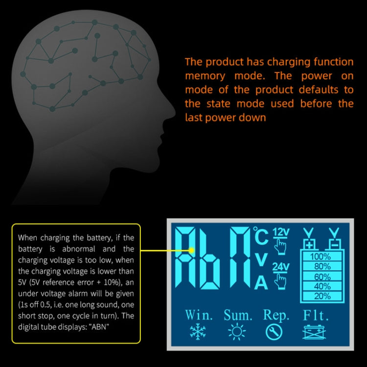 10. Fully automatic battery charger, suitable for most battery types, including lithium batteries, 12V-24V 6AH-120AH lead-acid batteries (GEL, AGM, WET, SLA, DEEP CYCLE)