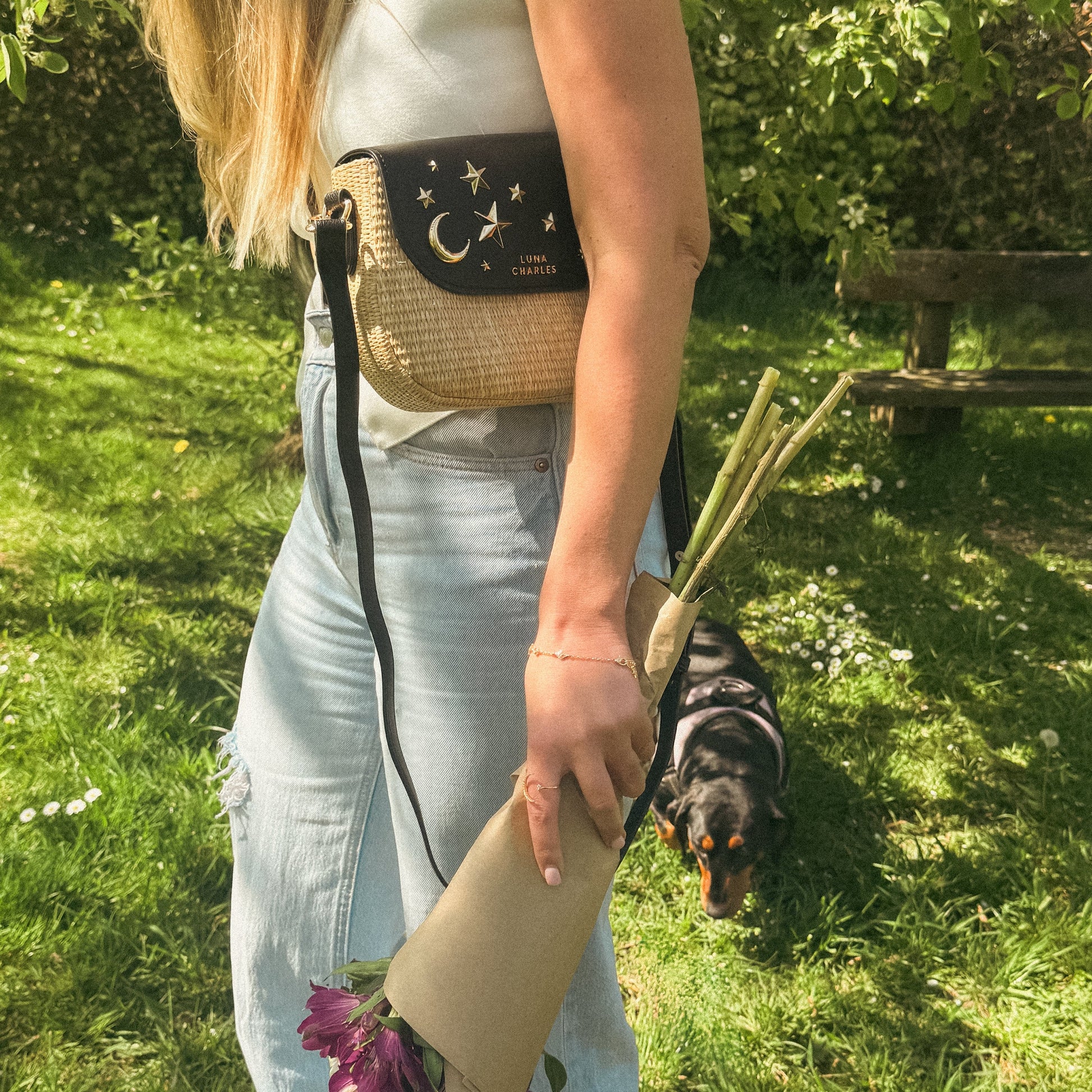 Be a real star with the Elena handbag! Crafted with natural rattan and vegan leather, it's adorned with glimmering gold moons and stars, it's the perfect accessory for those days when you want to shine.