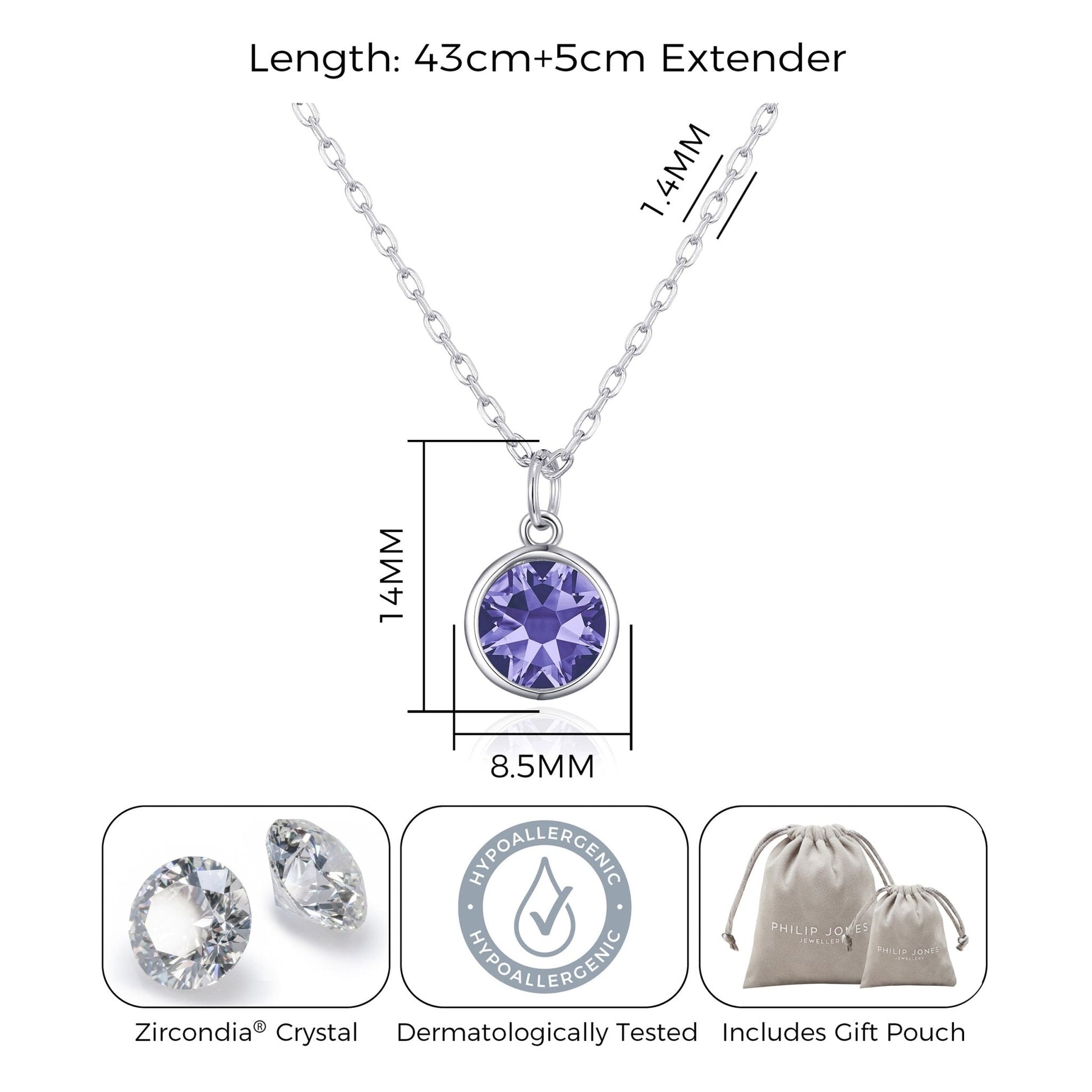 Celebrate your February birthday in style with this Philip Jones Birthstone Necklace created with genuine 8mm Zircondia® Crystals. Crafted with a silver plated brass alloy, this elegant pendant measures 14mm (H) x 8.5mm (W) and is suspended on a 43cm cable chain with a 6cm extender secured with a lobster claw closure. The perfect addition to any jewellery collection, the stunning amethyst shade of these crystals will add a touch of sparkle to any look.
