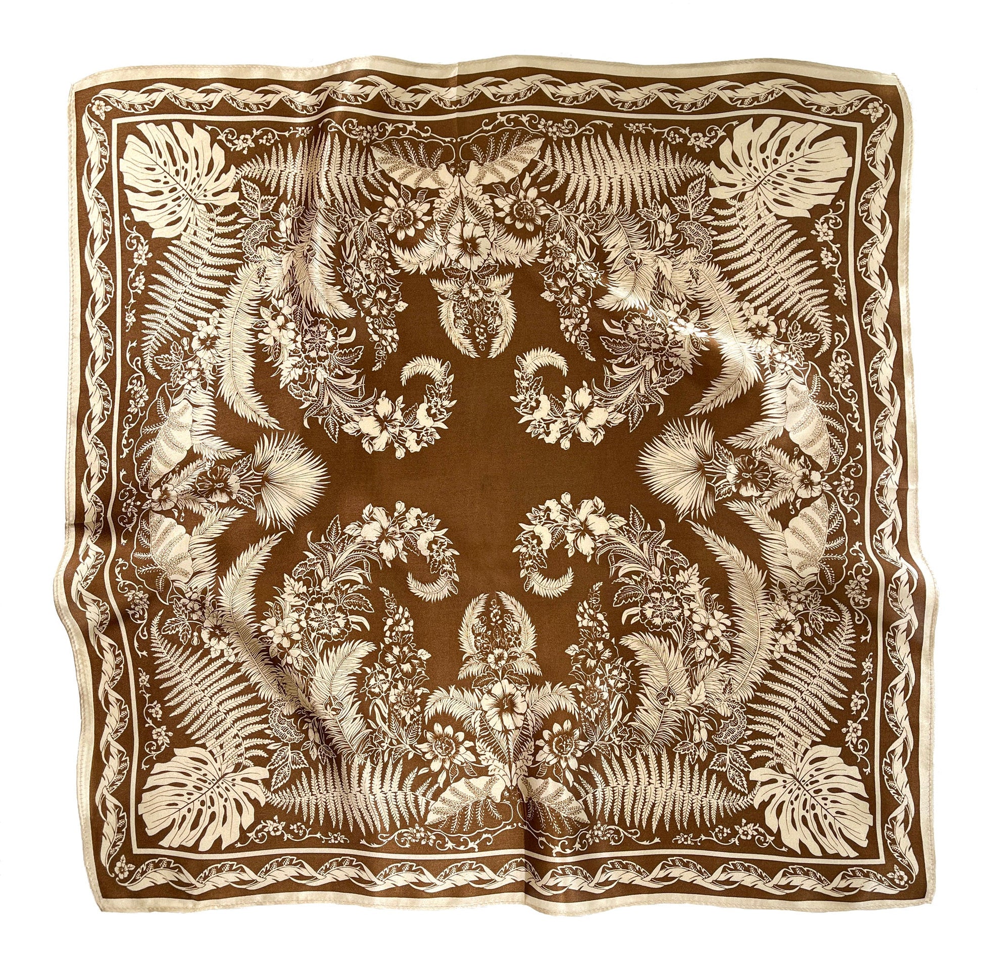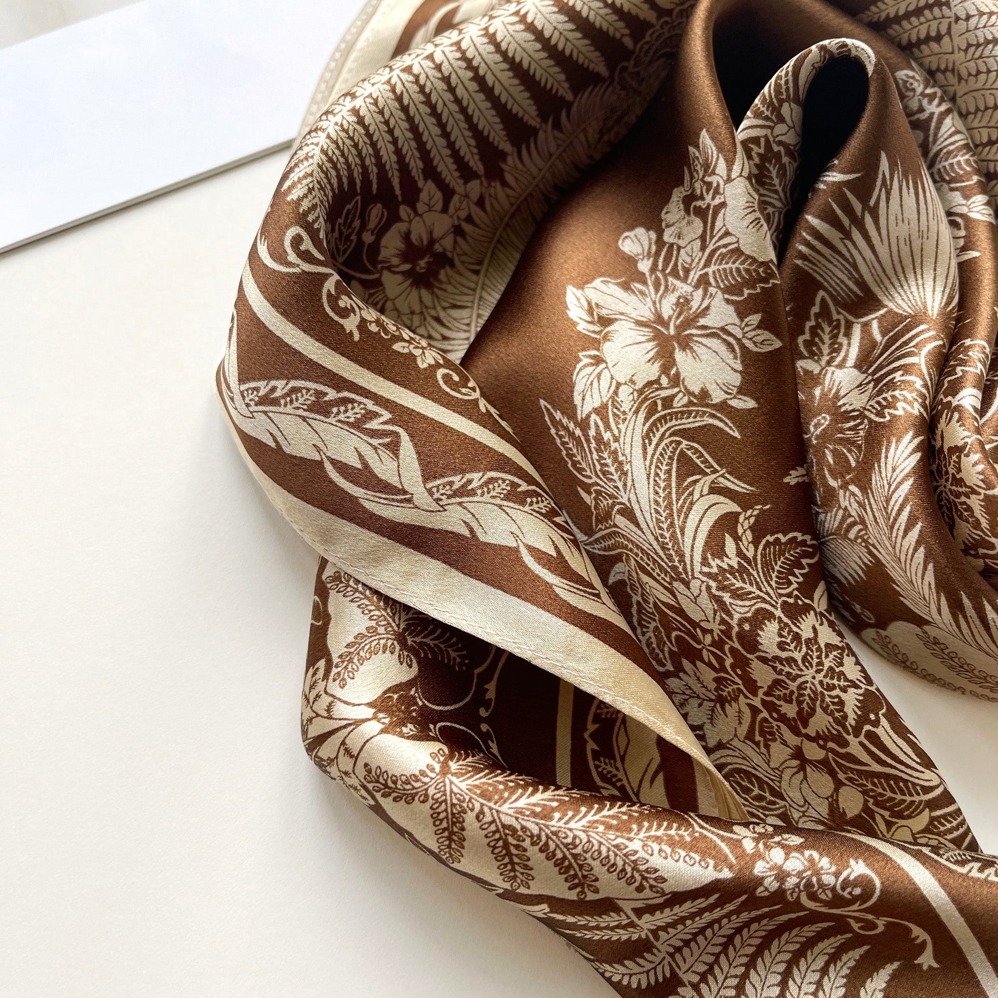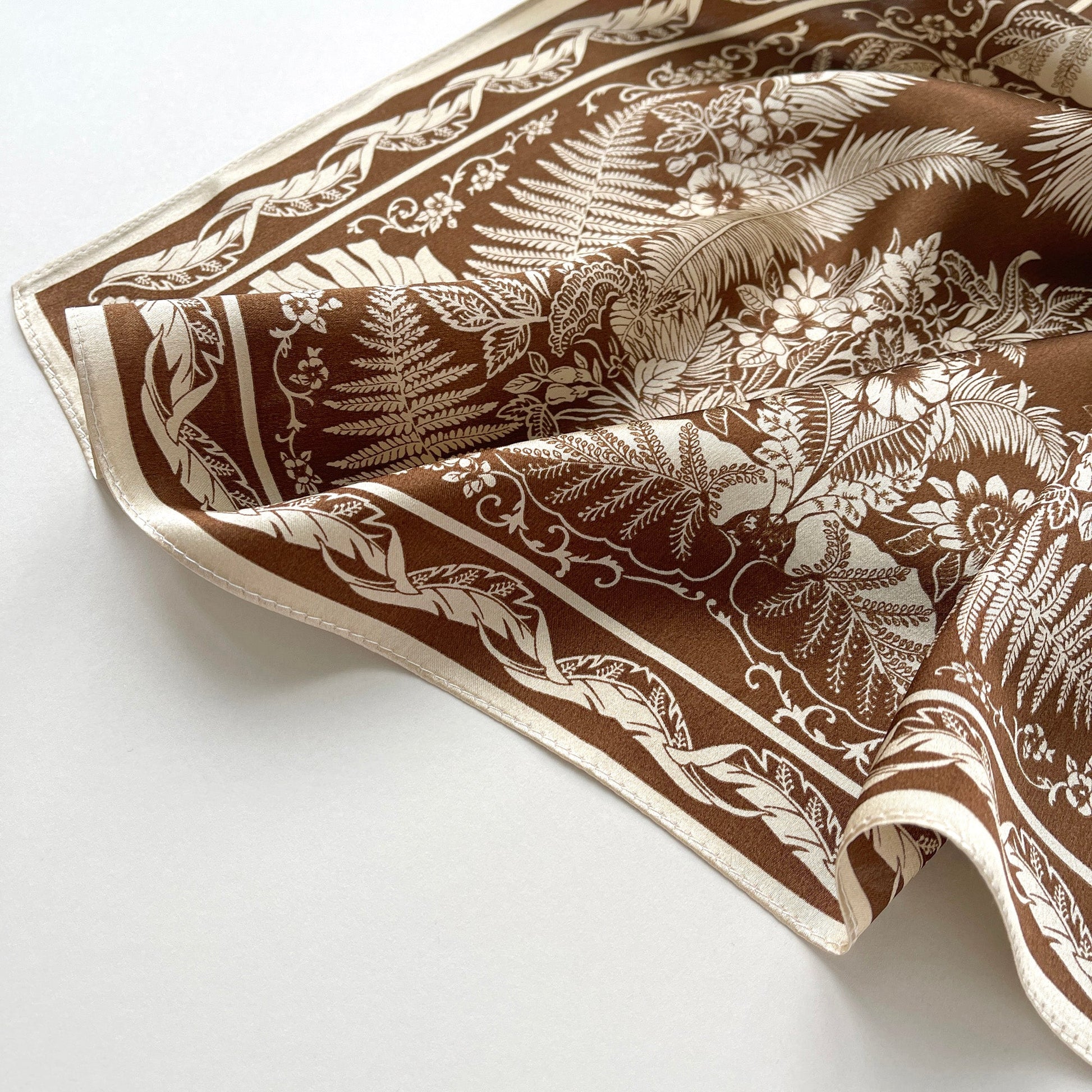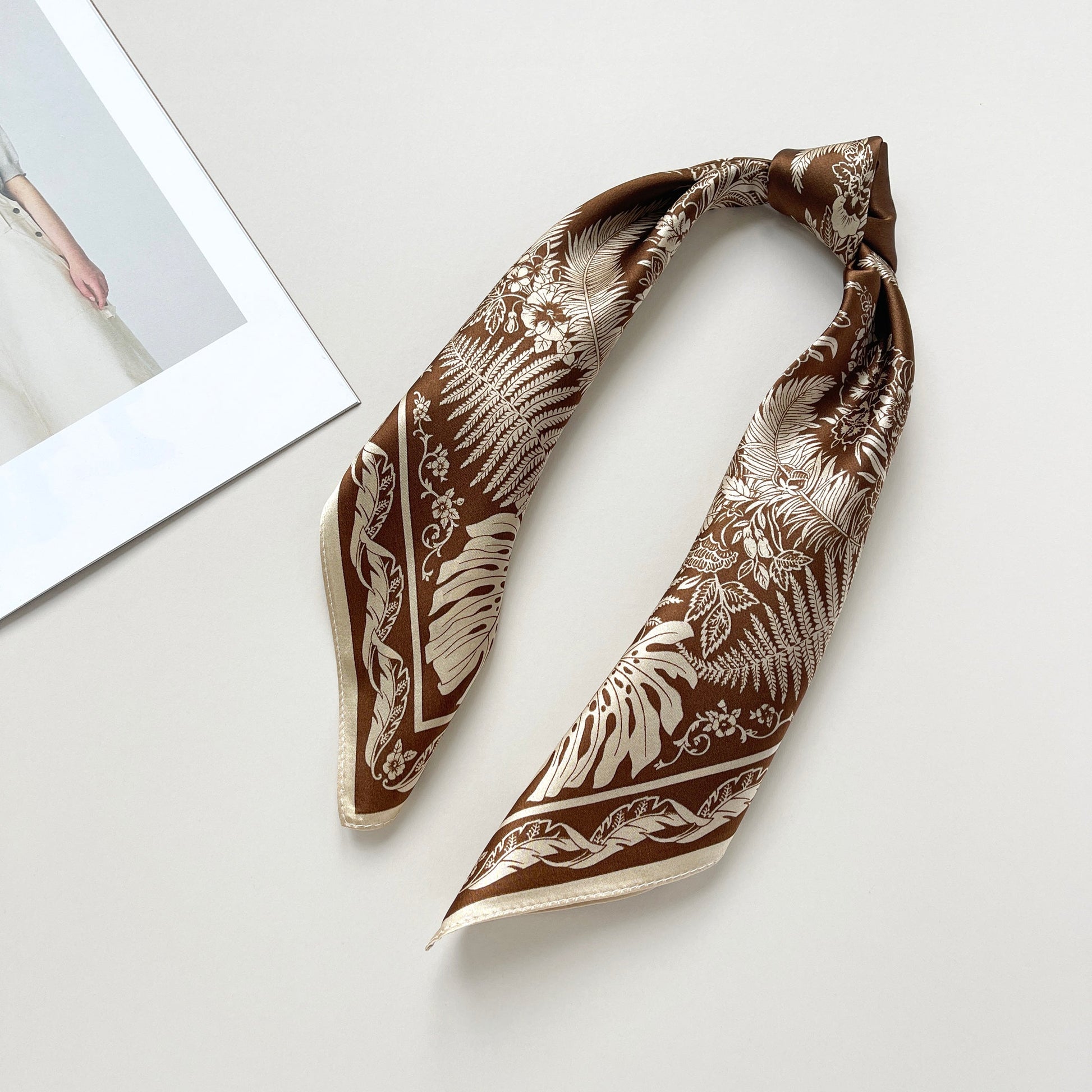 Introducing our stunning leaves pattern silk bandana scarf for women, available in two captivating colours: bronze and black. The bronze exudes warmth and earthy allure, while the black offers a classic and versatile option. Inspired by nature's beauty, this small square silk scarf showcases the enchanting allure of monstera and fern leaves, adding a touch of botanical sophistication and timeless beauty to your wardrobe.