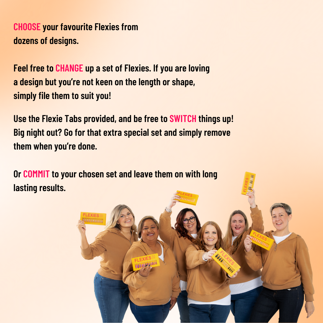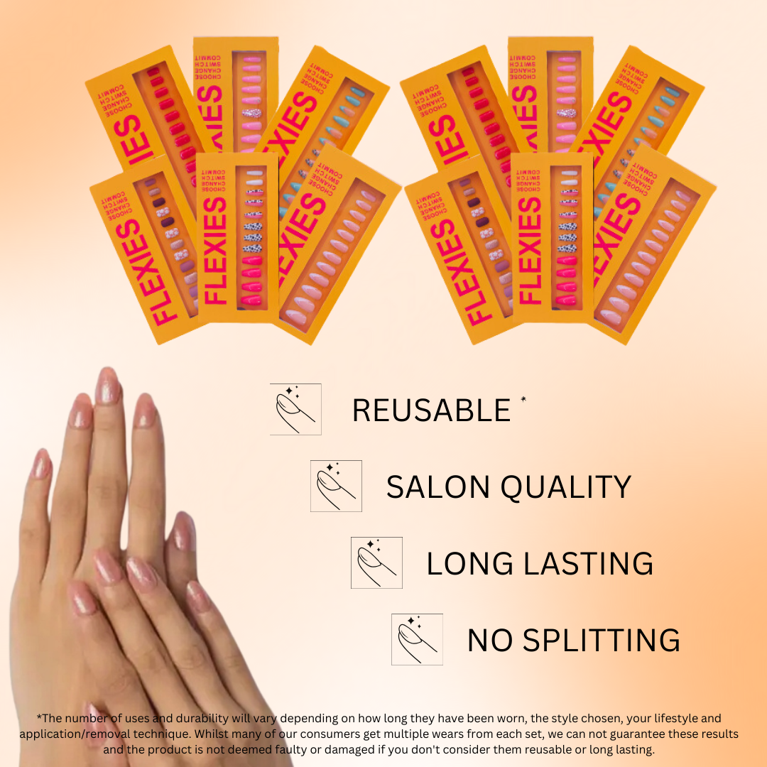 * The number of uses will vary depending on how long they have been worn, the style chosen, your lifestyle and application/removal technique. Whilst many of our consumers get multiple wears from each set, we can not guarantee these results and the product is not deemed faulty or damaged if you don't consider them reusable. ** Flexies are expected to last 3-5 days, sometimes longer. However, the results will vary based upon the style chosen, your lifestyle, the condition of your natural nails, the quantity of oil in your natural nails and your application technique. We can not guarantee results and the product is not deemed faulty or damaged based upon how long they last. *** Clipping and filing the Flexies will inevitably weaken the paint. Flexies are made with high quality materials and many of our consumers clip them without resulting in any issues. However, if you do clip them and the paint starts to chip with wear & tear, this will not be considered a fault with the product. We do our best to make sure the colours displayed on our website are accurate. However, for technical reasons, they may vary from the images shown.