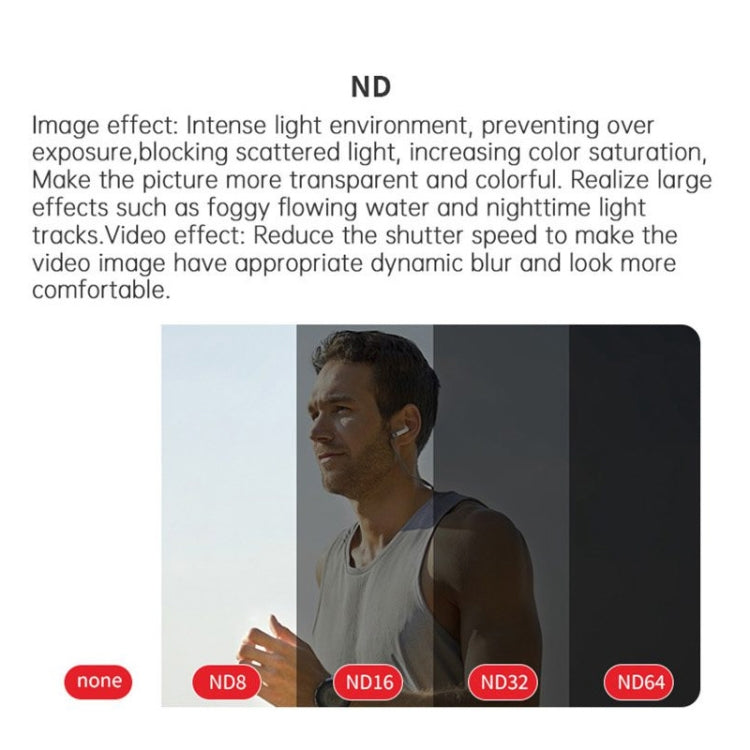 5. ND Filter: You can get more freedom to control aperture and shutter, bring more exposure methods and creation space for photography creation, and effectively prevent overexposure. The number behind ND represents the ability of the ND mirror to block light.