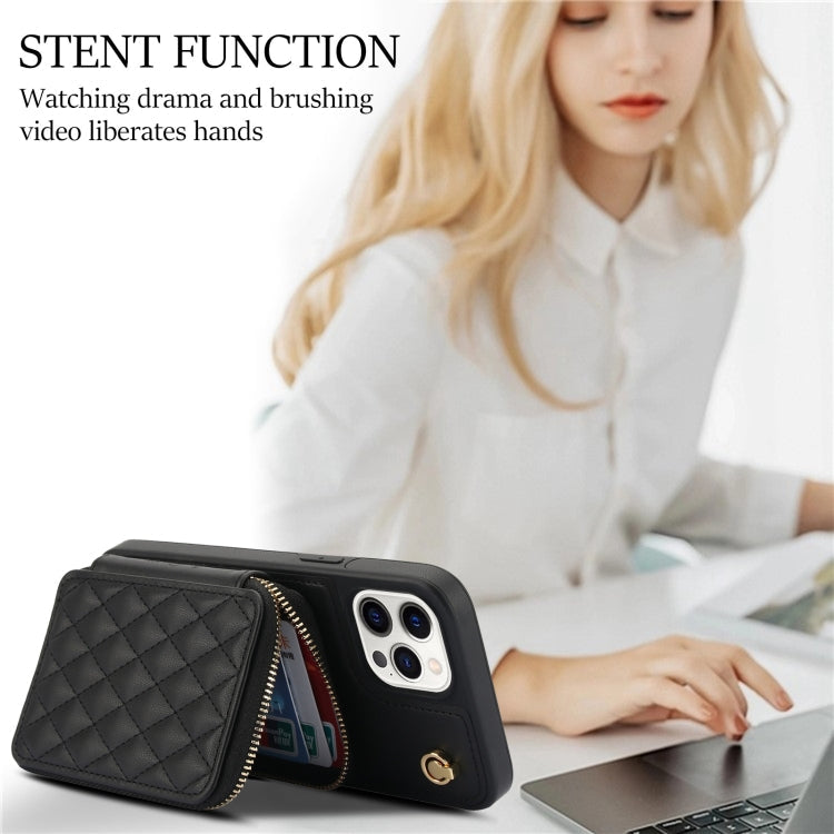 For iPhone 12 / 12 Pro AwQuer Crossbody Zipper Wallet Rhombic Leather Back Phone Case(Black)
