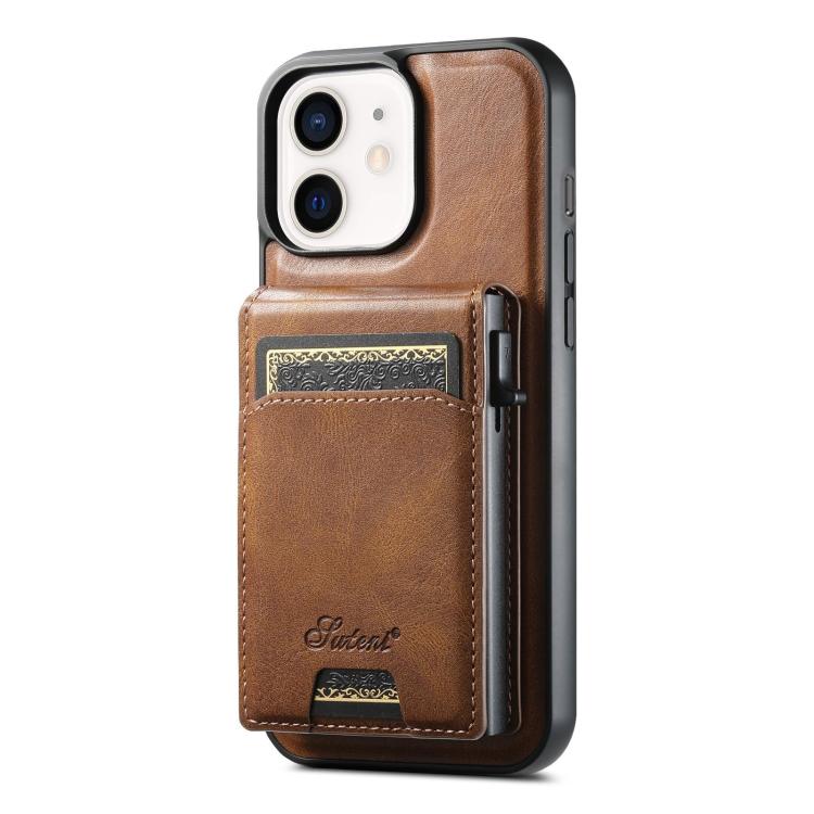 For iPhone 12 Suteni H19 Oil Wax 2-in-1 MagSafe Removable Card Box Back Phone Case(Brown)