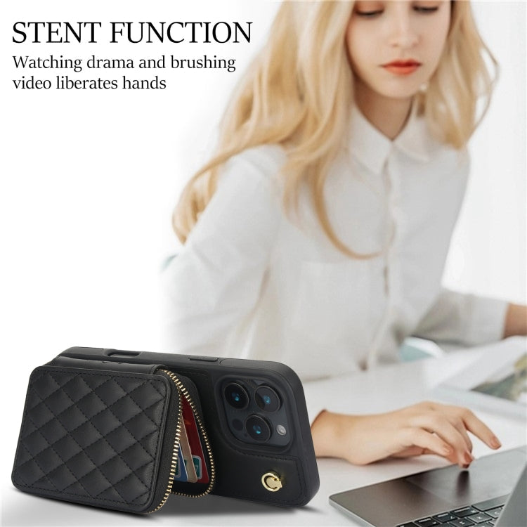 For iPhone 16 Pro Max AwQuer Crossbody Zipper Wallet Rhombic Leather Back Phone Case(Black)