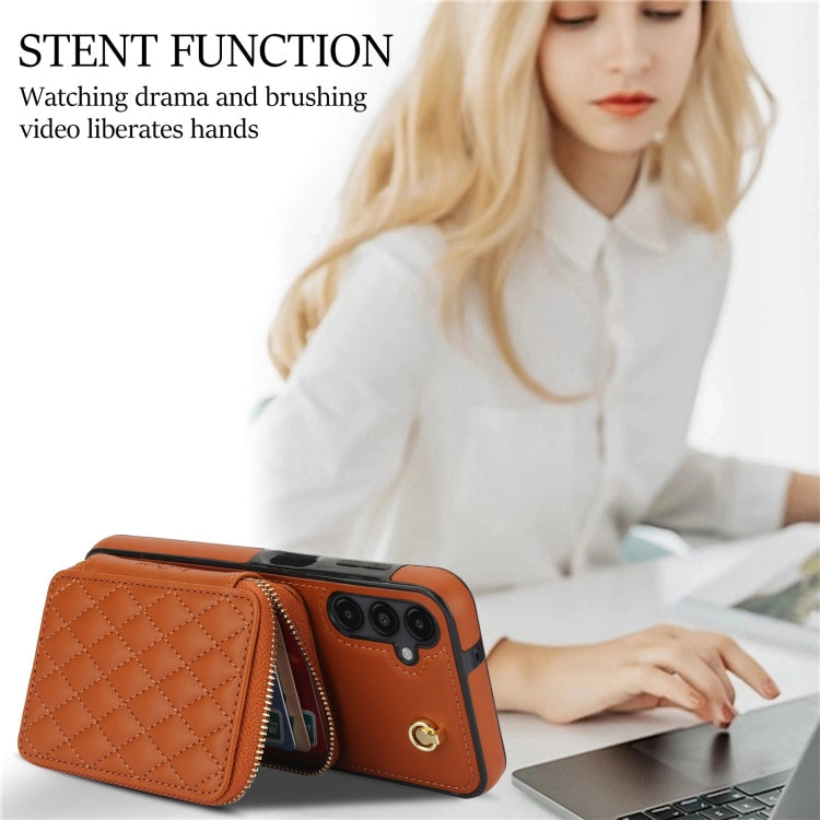 For Samsung Galaxy A14 4G / 5G AwQuer Crossbody Zipper Wallet Rhombic Leather Back Phone Case(Brown)
