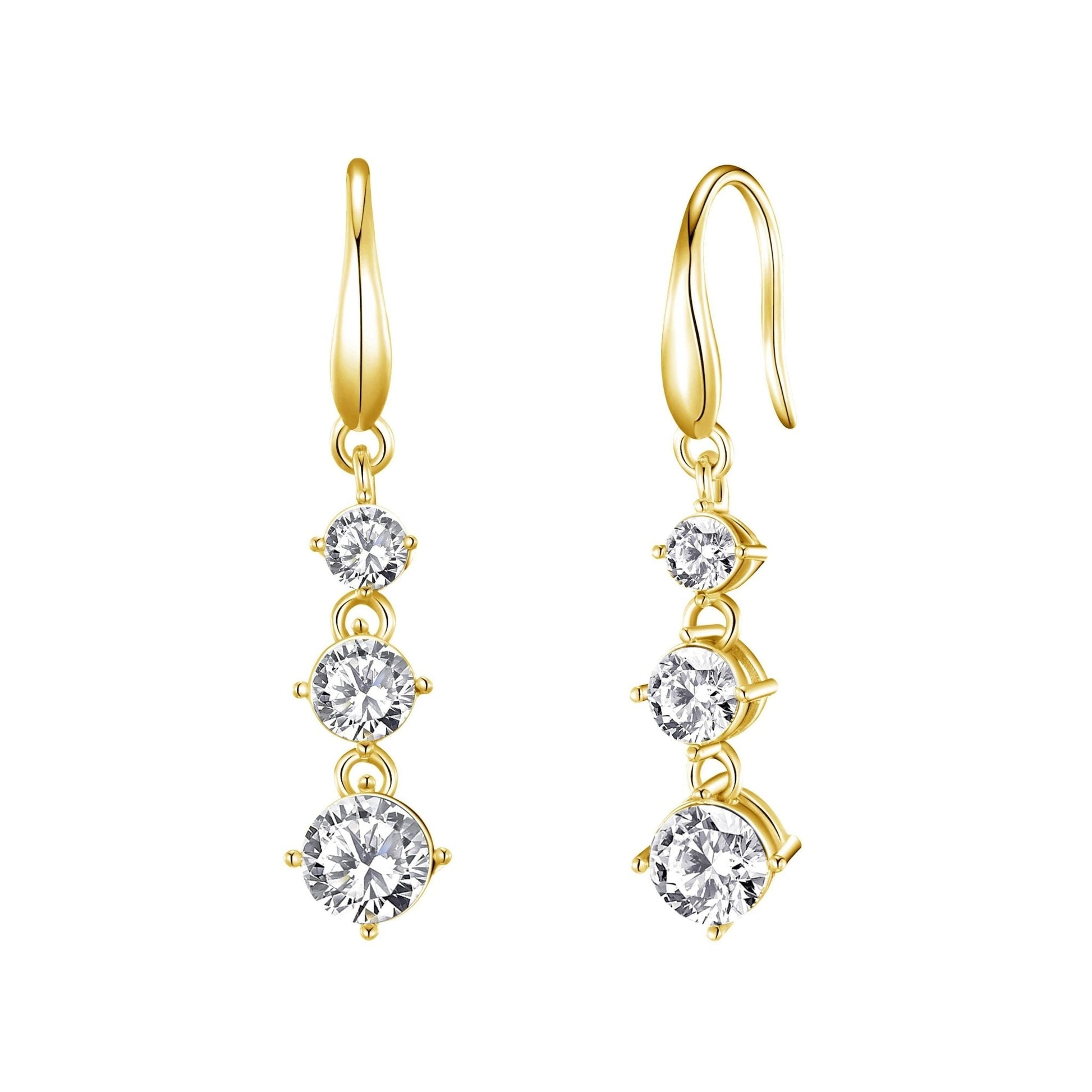 Elevate your style with these elegant gold-plated drop earrings, featuring six clear Zircondia® crystals in graduated sizes from 3mm to 5mm. Lightweight and hypoallergenic, they offer comfortable wear with a secure French closure. Perfectly sized at 30mm by 5.2mm, these earrings add a subtle sparkle to any outfit. Presented in a stylish gift pouch, they make an ideal gift or a luxurious treat for yourself.