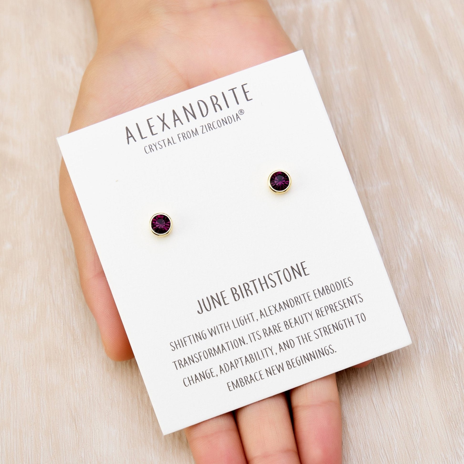 These Philip Jones gold plated June (Alexandrite) Birthstone Earrings are the perfect way to show off your birth month in style! Crafted from silver plated brass alloy, each earring is set with a hypoallergenic 6mm round Zircondia® crystal for a luminous, eye-catching look. Packaged in a gift pouch with a quote card, these earrings make a meaningful and thoughtful gift.