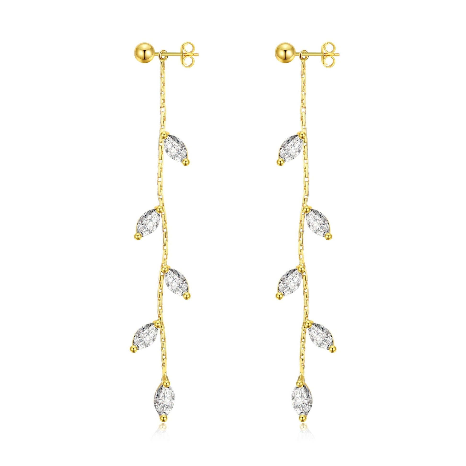 Gorgeously crafted with genuine Zircondia® crystal marquise shapes, these Philip Jones gold plated dangle earrings have undeniable beauty and a luxe feel. Hypoallergenic and light on the ears, these earrings are perfect for all occasions!