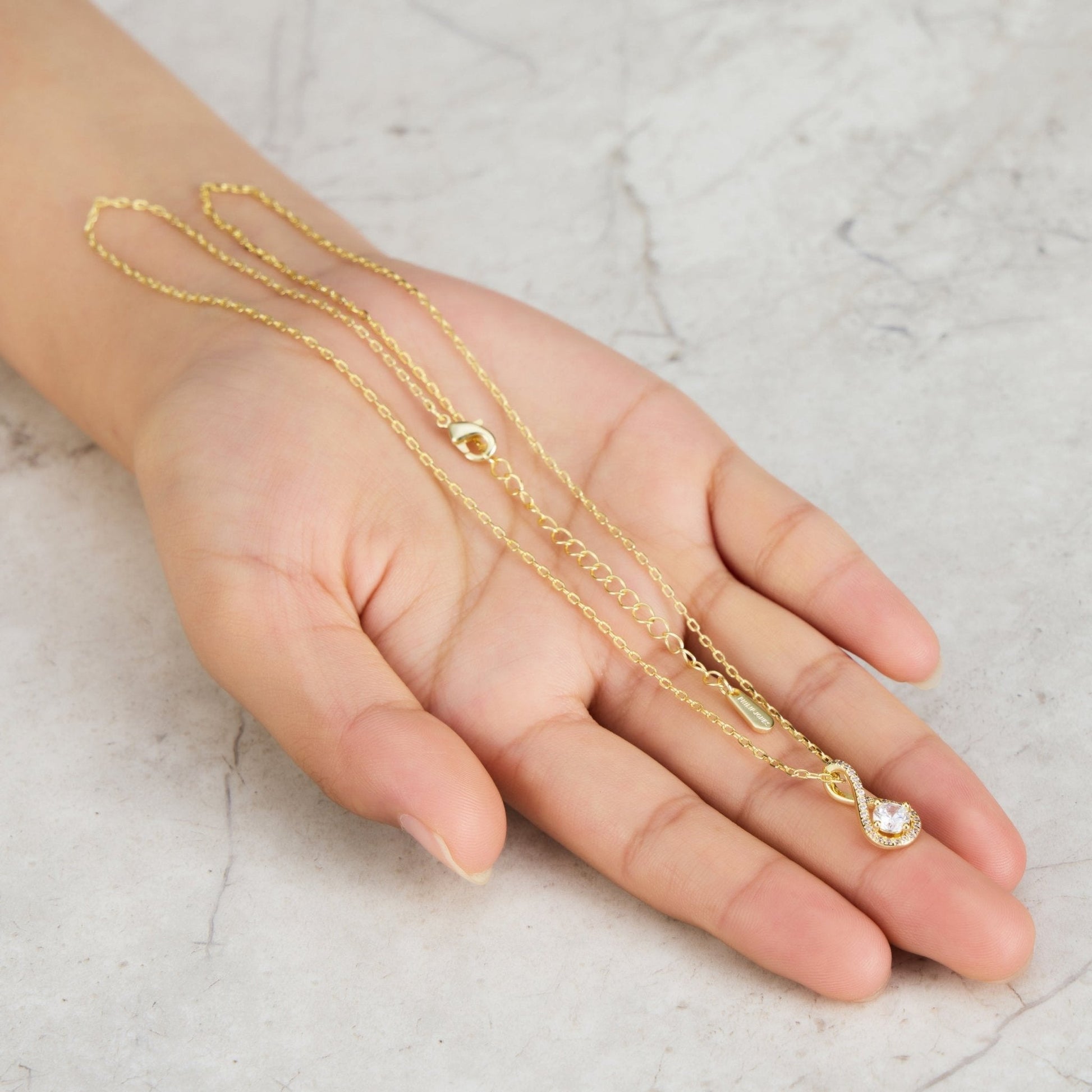 Elevate your style with this exquisite Gold Plated Solitaire Twist Necklace featuring sparkling Zircondia® Crystals. The details of this necklace are carefully crafted, making it hypoallergenic and perfect for everyday wear. Made with high-quality gold plated brass alloy, it boasts a stunning pendant with dimensions of 17mm (H) x 8.5mm (W). The necklace length is 43cm with an additional 5cm extender chain for a customized fit. The cable chain and lobster claw closure add a touch of elegance to the overall design. Be captivated by the 30 dazzling 1mm round crystals and a single 7mm round crystal, carefully placed to create a mesmerizing effect. Packaged in a chic gift pouch, this necklace is a must-have for any fashion-forward individual.