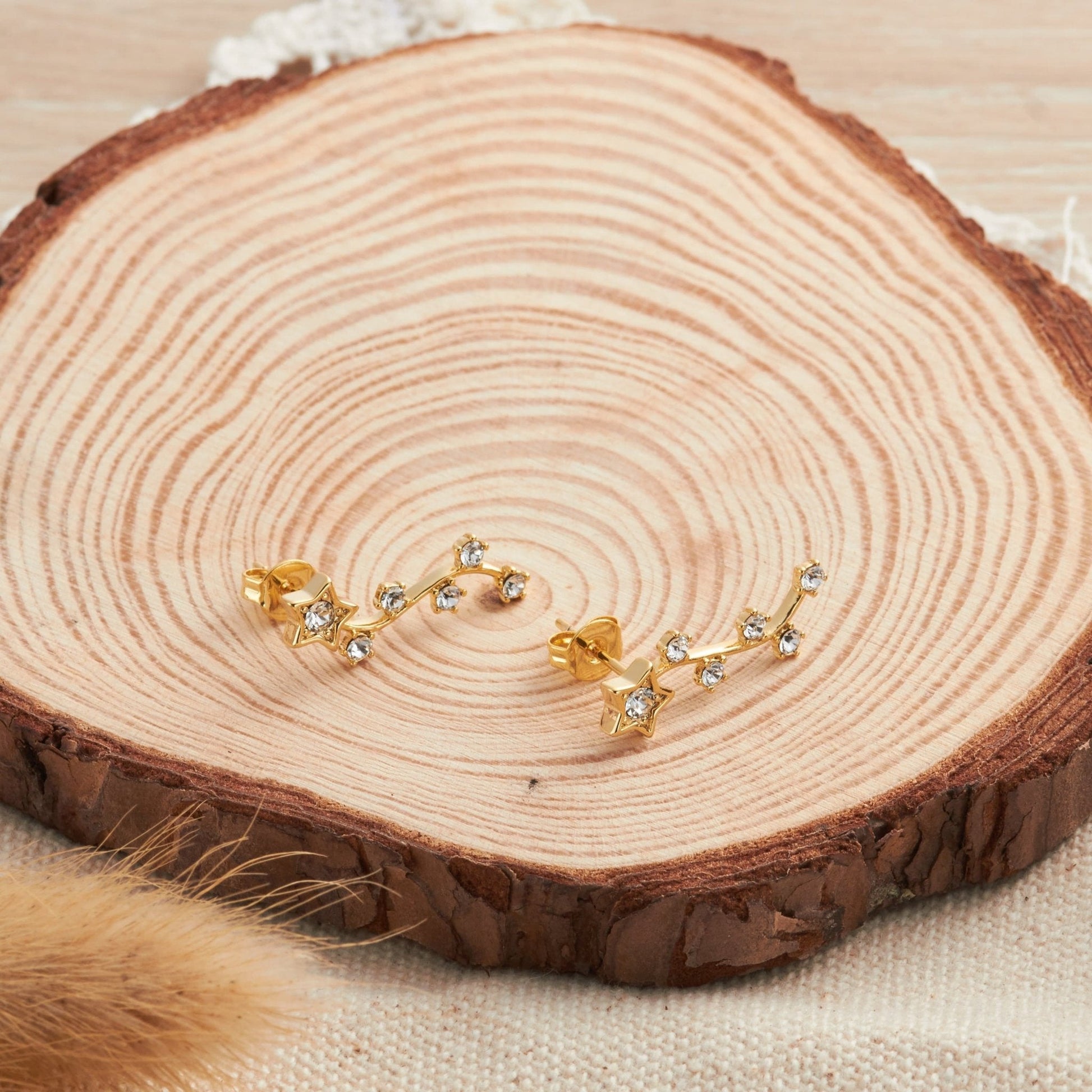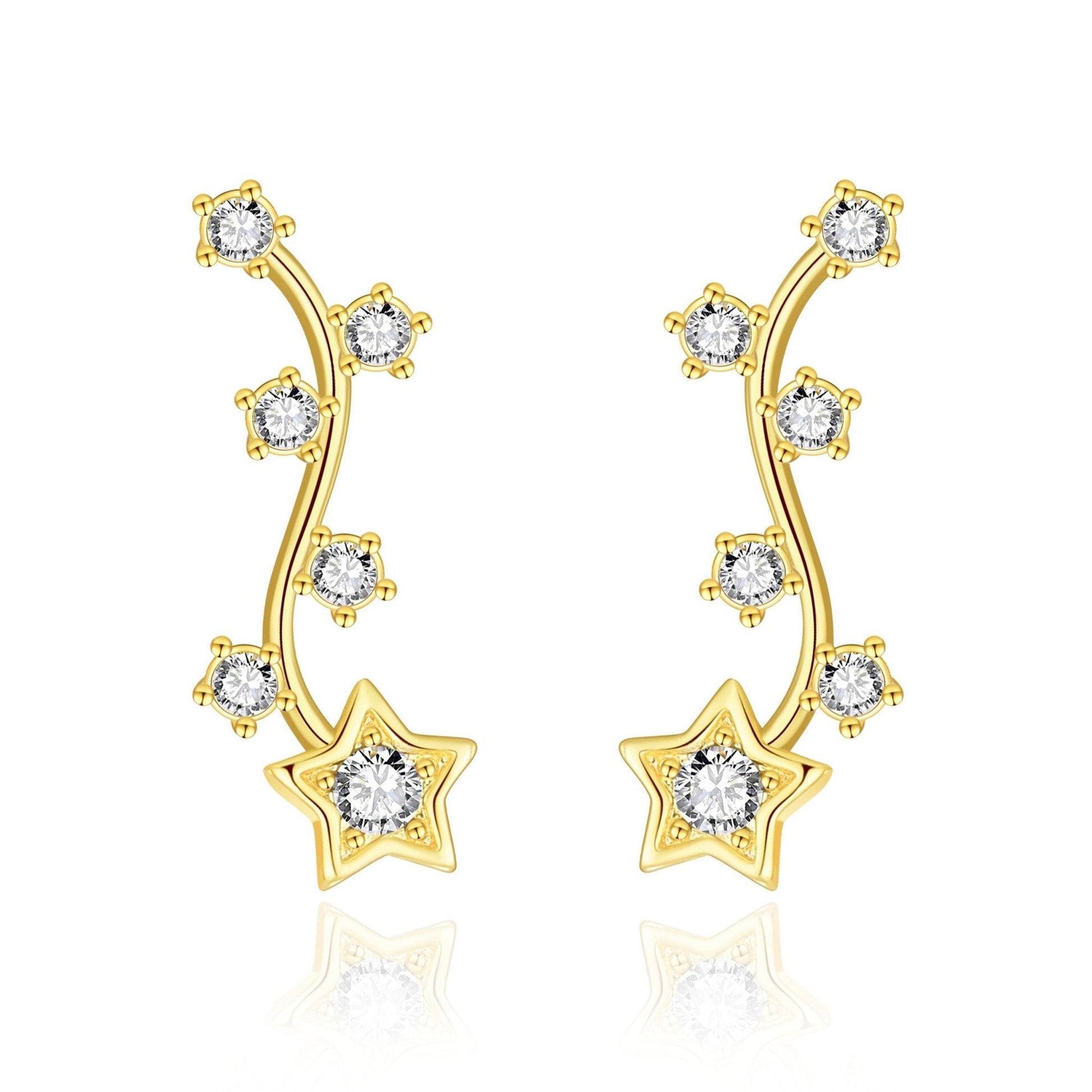 Enhance your style with these Gold Plated Star Climber Earrings created with Zircondia® Crystals. Hypoallergenic and lightweight, these earrings are perfect for everyday wear. The stunning round crystals add a touch of sparkle to any outfit, and the secure Butterfly closure keeps them in place. Comes in a convenient gift pouch for easy storage and gifting. Add a little shine to your wardrobe with these elegant earrings.