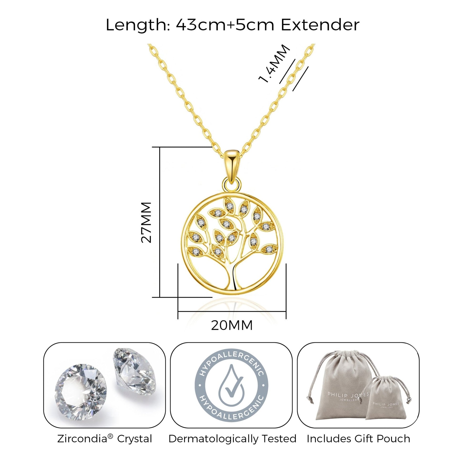 Indulge in the beauty and symbolism of the Gold Plated Tree of Life Necklace, featuring stunning Zircondia® Crystals. Hypoallergenic and crafted with high-quality brass alloy, this necklace is both stylish and gentle on the skin. The 27mm pendant and 43cm chain make for a perfect fit, while the lobster claw closure ensures secure and easy wear. Comes in a charming gift pouch for a thoughtful present.