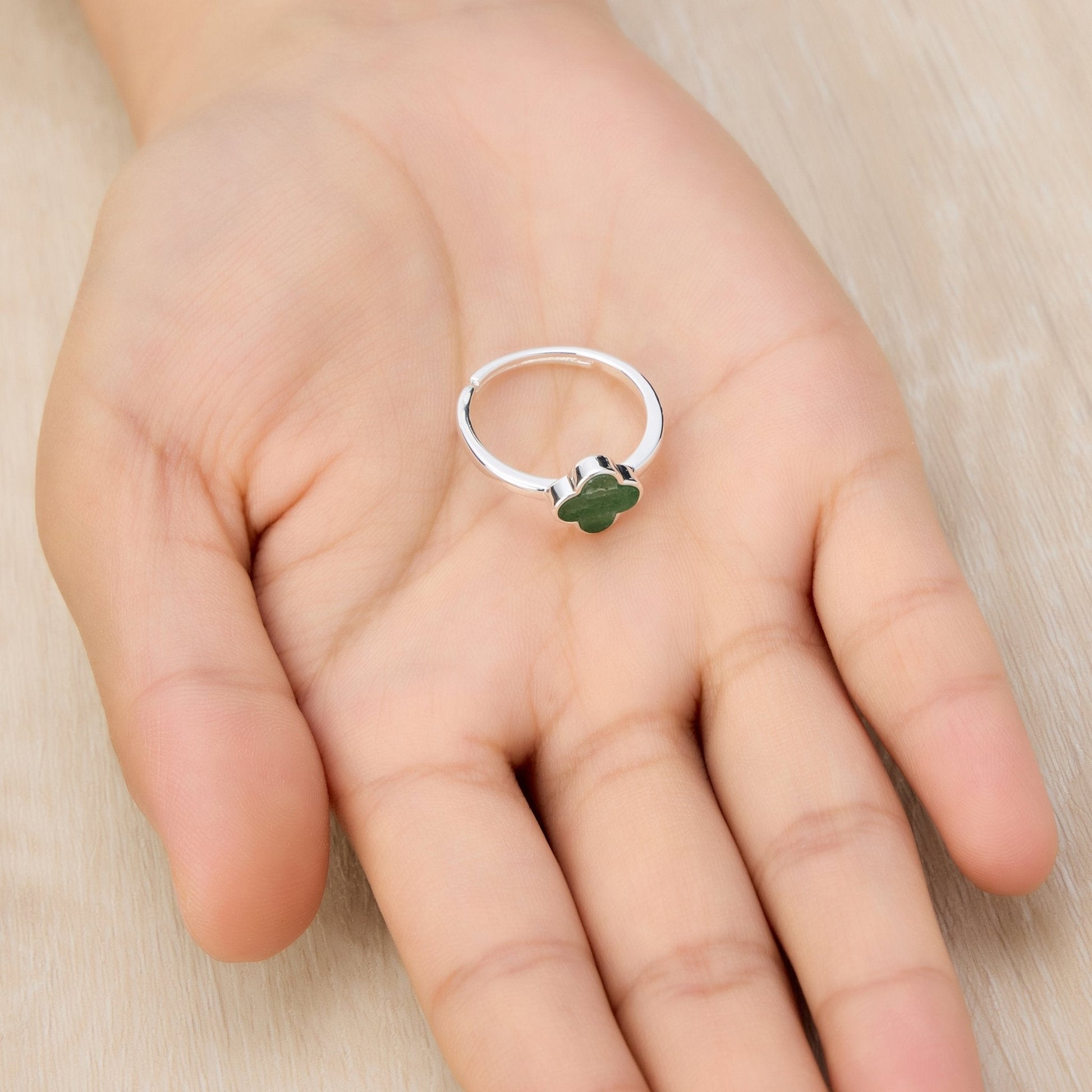 Elevate your style with our Silver Plated Clover Ring featuring authentic Green Aventurine gemstone. This hypoallergenic piece showcases a stunning green 9mm clover-shaped stone on a brass alloy base. Conveniently adjustable from size M to Q with a delicate 2mm band. Each Philip Jones creation arrives in an elegant gift pouch, perfect for treating yourself or surprising someone special. The genuine gemstone's natural lustre catches light beautifully, adding sophisticated charm to any outfit.