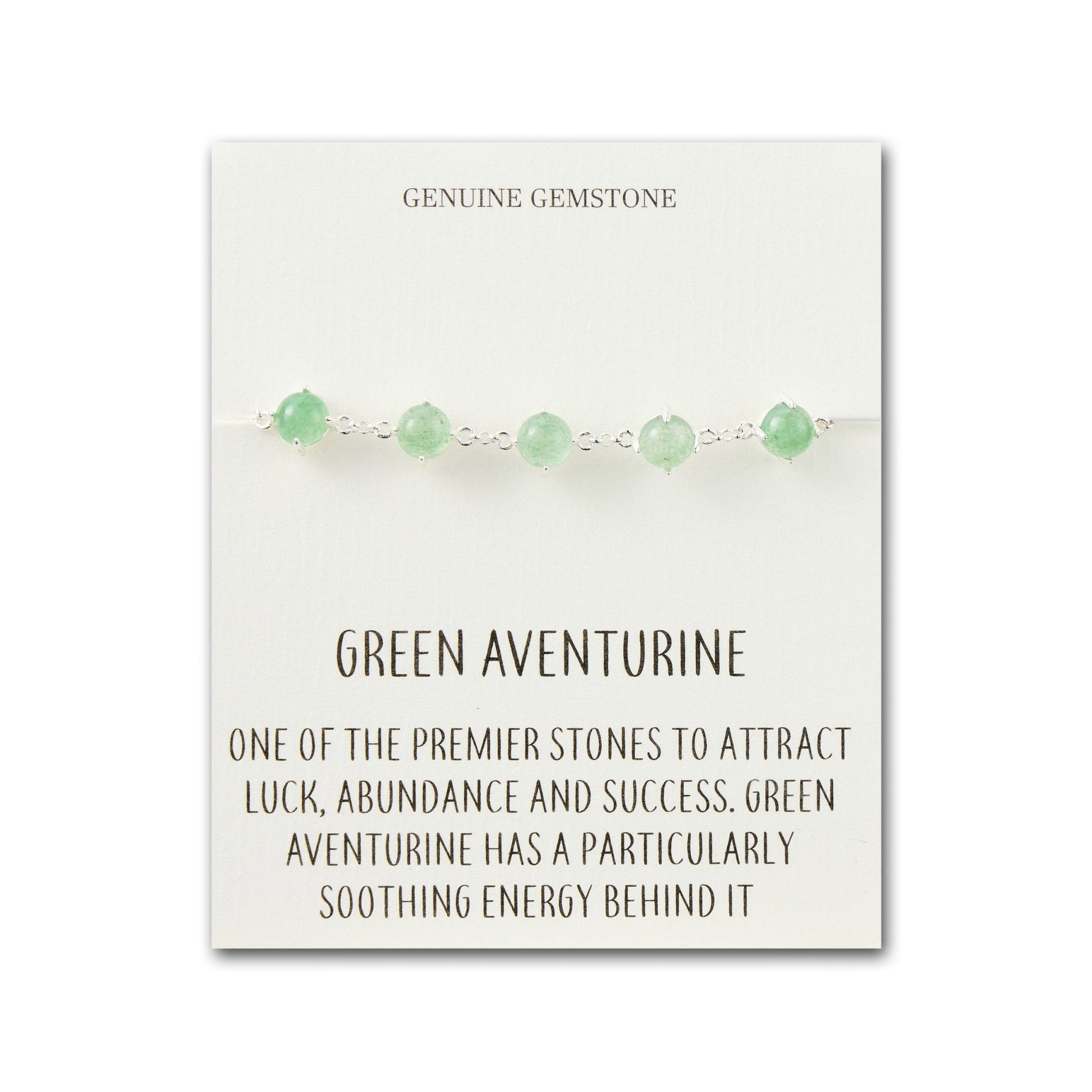 Philip Jones presents this stunning and fashionable Green Aventurine Gemstone Bracelet. This unique piece features a lobster claw clasp, an 17.8cm length with a 2.5cm extender, and a weight of 3.6g. For added detail, this bracelet is adorned with 5 round 6mm Green Aventurine stones. Treat yourself to elegance with this beautiful accessory!