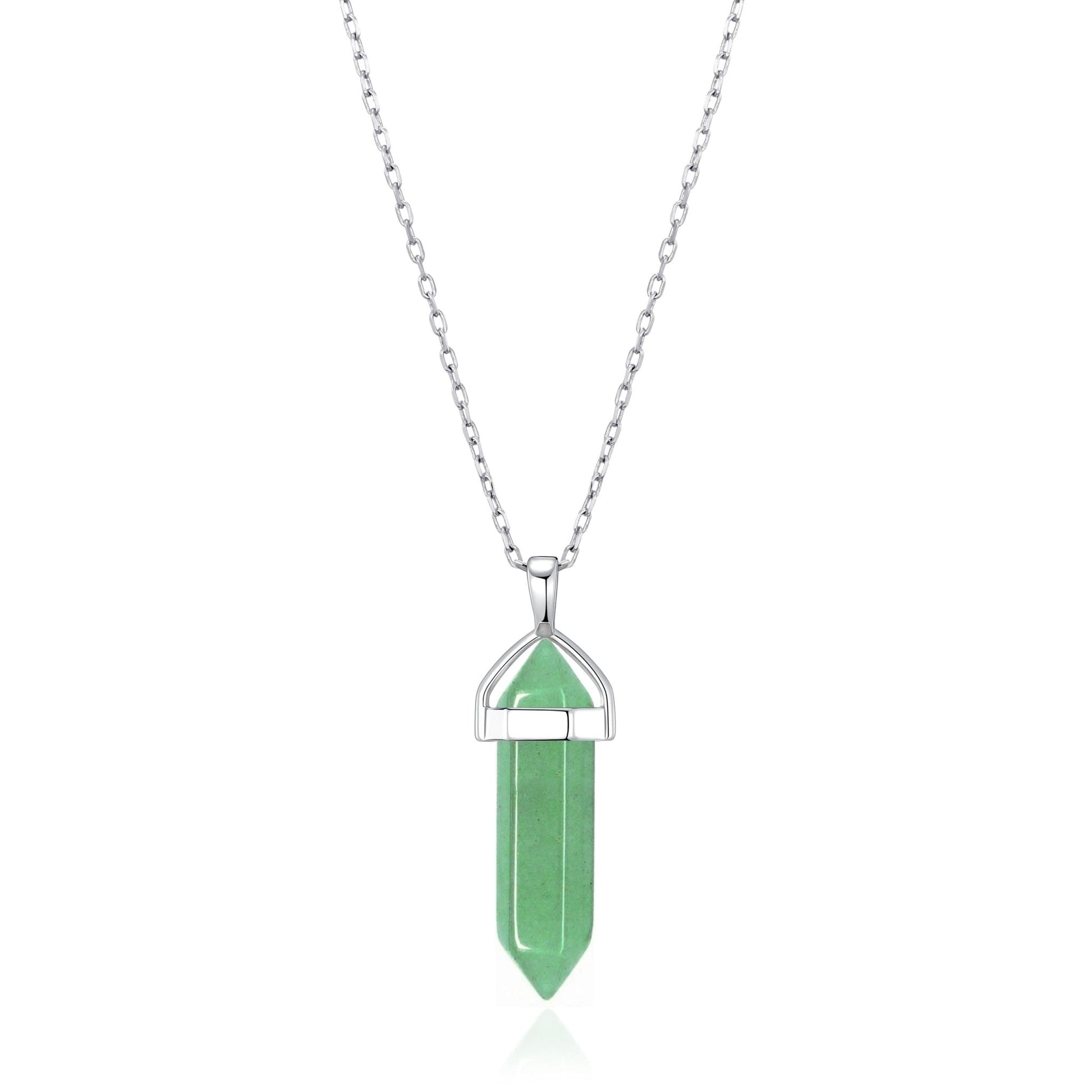 Philip Jones Craftsmanship: Silver Plating and Brass Alloy make up the construction of the Pendant Necklace. It is 43cm with an additional 5cm of extender, and features a cable chain and lobster claw closure. A single Green Aventurine Cylindrical stone of 28mm x 9mm is included, with a total weight of 6.6g. The Pendant dimensions measure in at 42mm (H) x 9mm (W).
