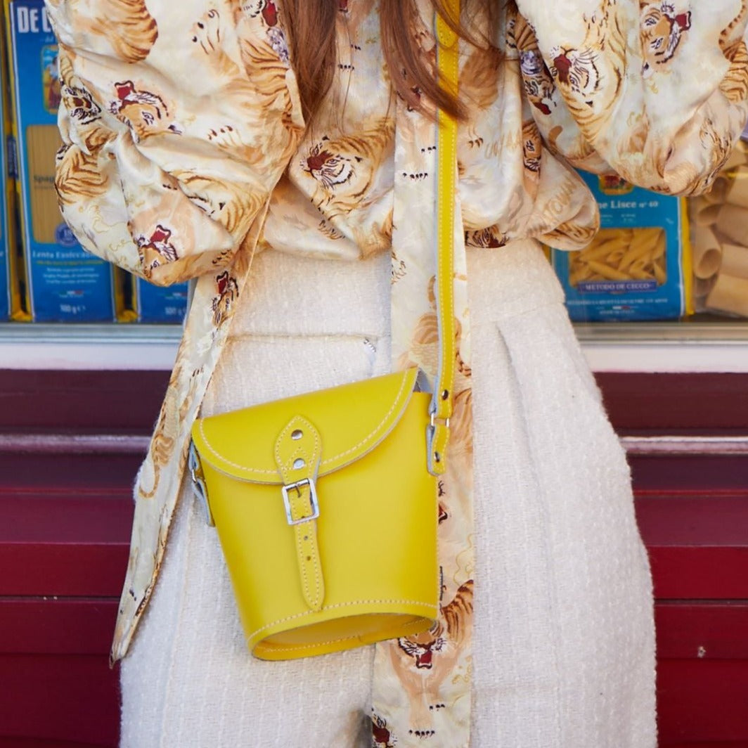 Model wears our Pastel Daffodil Yellow Barrel bag in the small size.