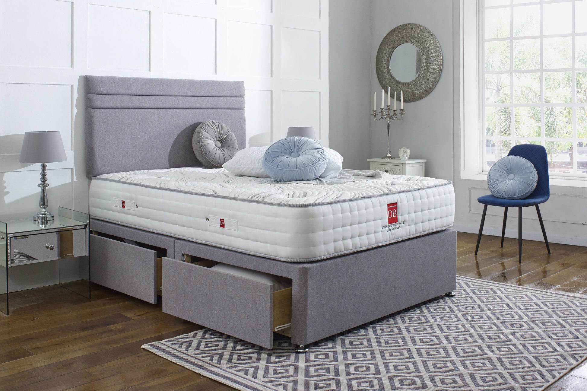 The divan bed base features 4 beautifully positioned chrome gliders as feet and also a number of chrome elements on the divan bed base itself in order to add a hint of elegance and style to your bedroom. The set includes a luxury mattress of your choice. Includes Hand Crafted and Pleated Strutted Headboard.