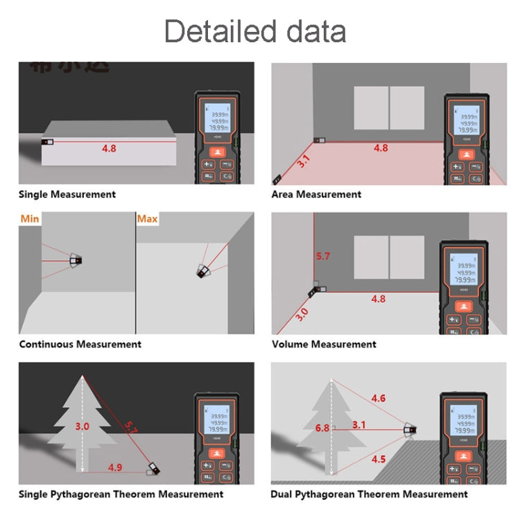 1. Measuring range: 0.05-40 m/0.05-60m/0.05-80m/0.05-100m