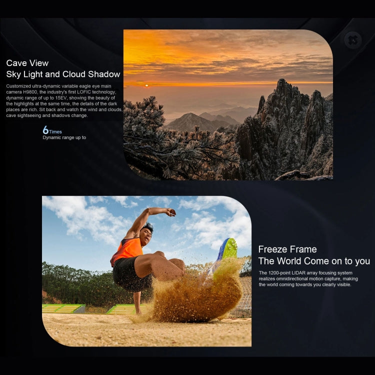 1. Dual Rear Camera: 50MP wide-angle camera (f/1.4-f/2.0 aperture, supports LOFIC technology, supports OIS optical image stabilization) + 180MP telephoto camera (f/2.6 aperture, supports OIS optical image stabilization) + 50MP ultra-wide-angle camera (f/2.0 aperture ) + LiDAR array focusing system, support AF