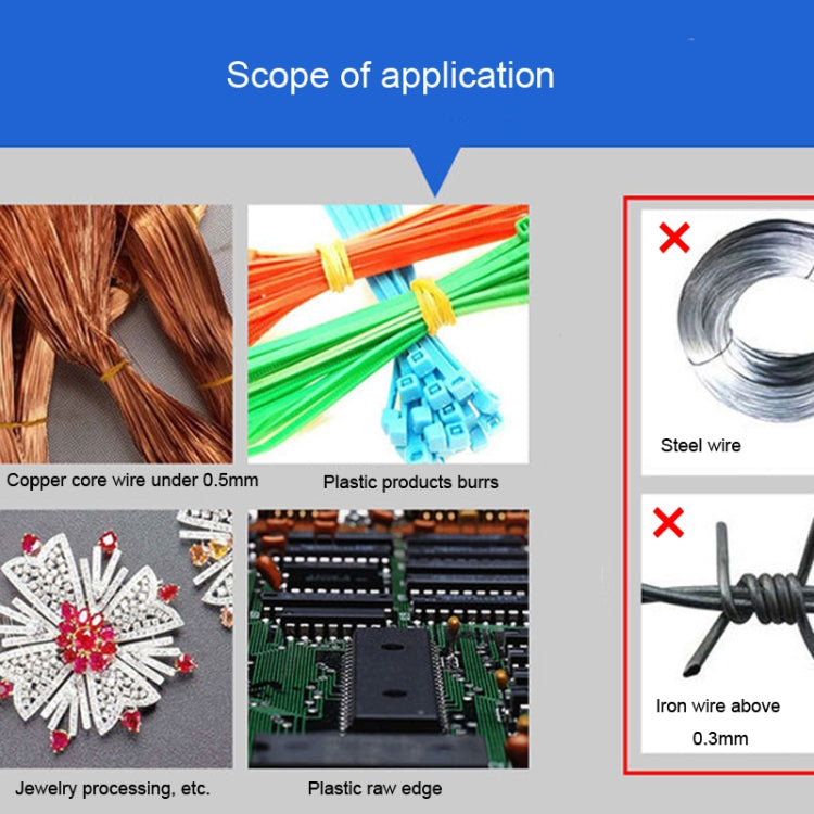 5. Application: suitable for cutting resin plastic or plastic models under 5 mm, copper wire under 2.5 mm, 1.5 mm iron wire