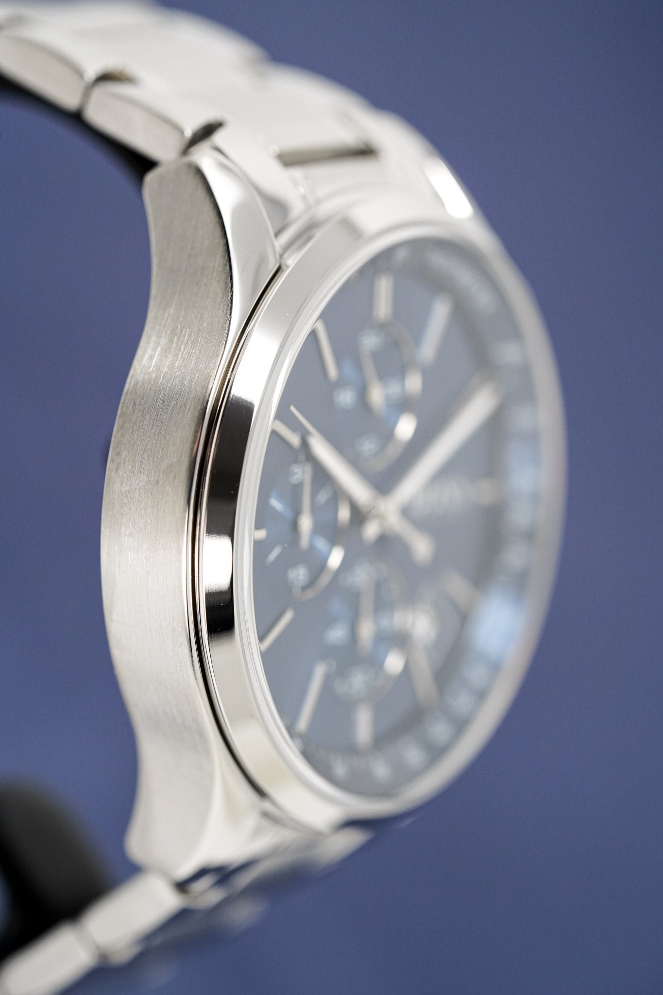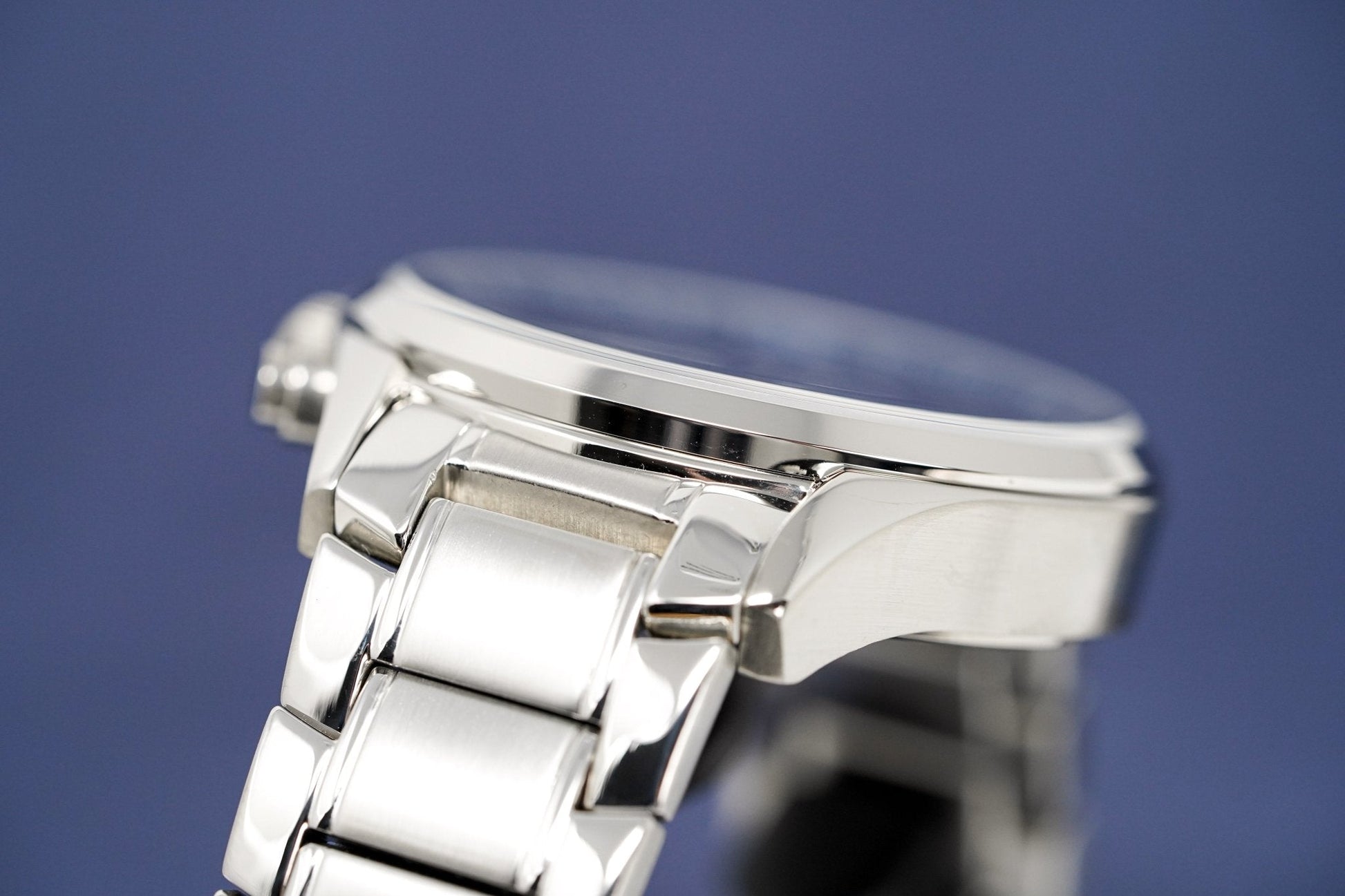 The striking blue dial, accented with silver-tone hands and indices, captures attention with its refined elegance. The chronograph functionality offers both style and practicality, allowing you to time your activities with precision. Housed in a durable stainless steel case and paired with a sleek, matching bracelet, this watch is built to withstand the demands of daily wear while maintaining a polished appearance.