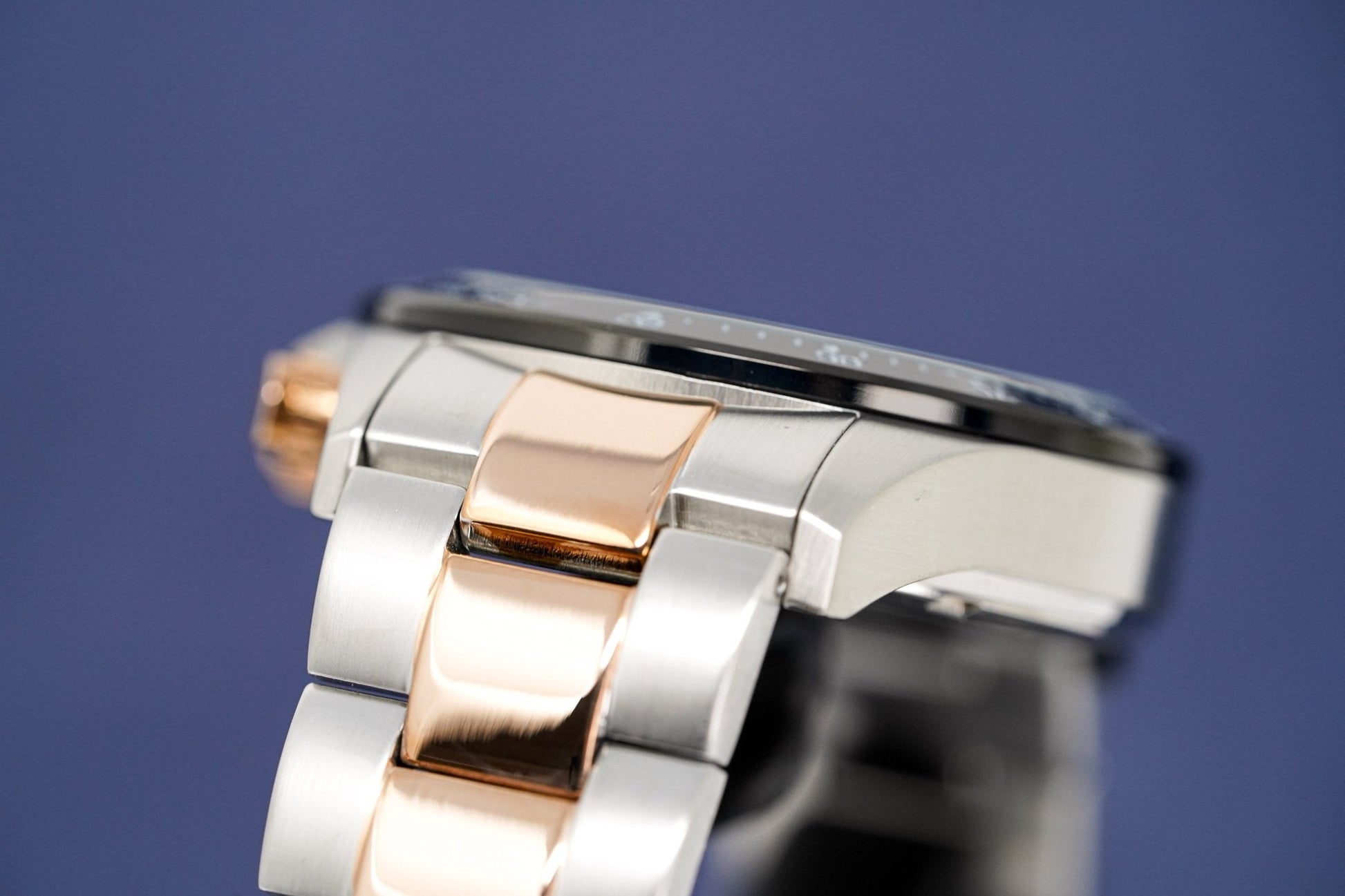 Blue Sunburst Dial With Outline. Luminous Steel Hands. Stainless Steel Hands. Date Window at 4:30.