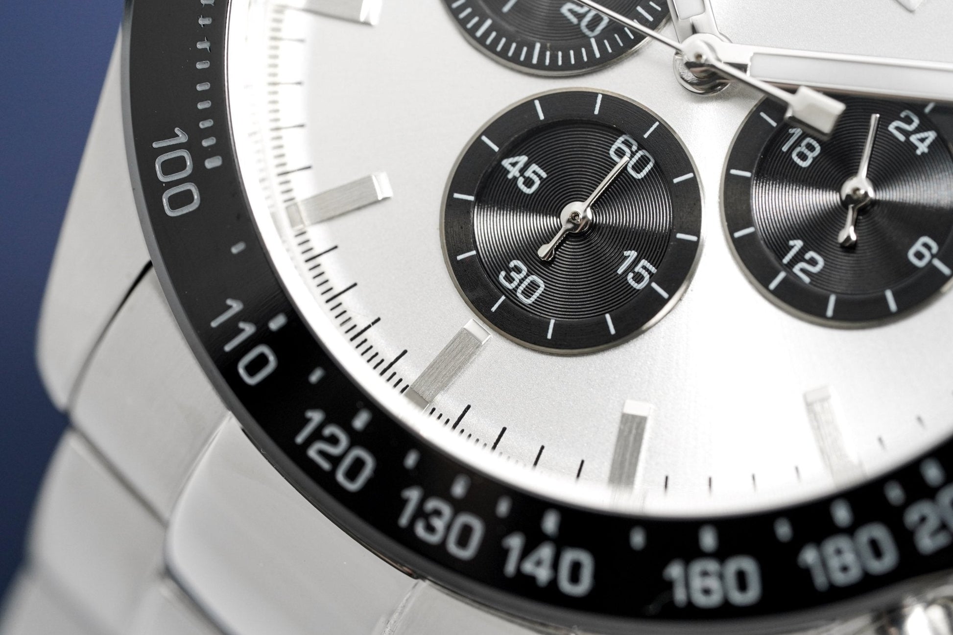 44mm Stainless Steel Case. Scratch Resistant Mineral Crystal. Black Tachymeter Bezel.