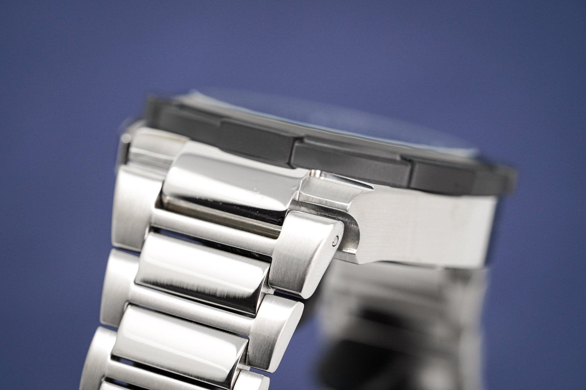 Black Guillochè Dial. Stainless Steel Hands. Stainless Steel Stick Indexes. Date Window at 4:30.