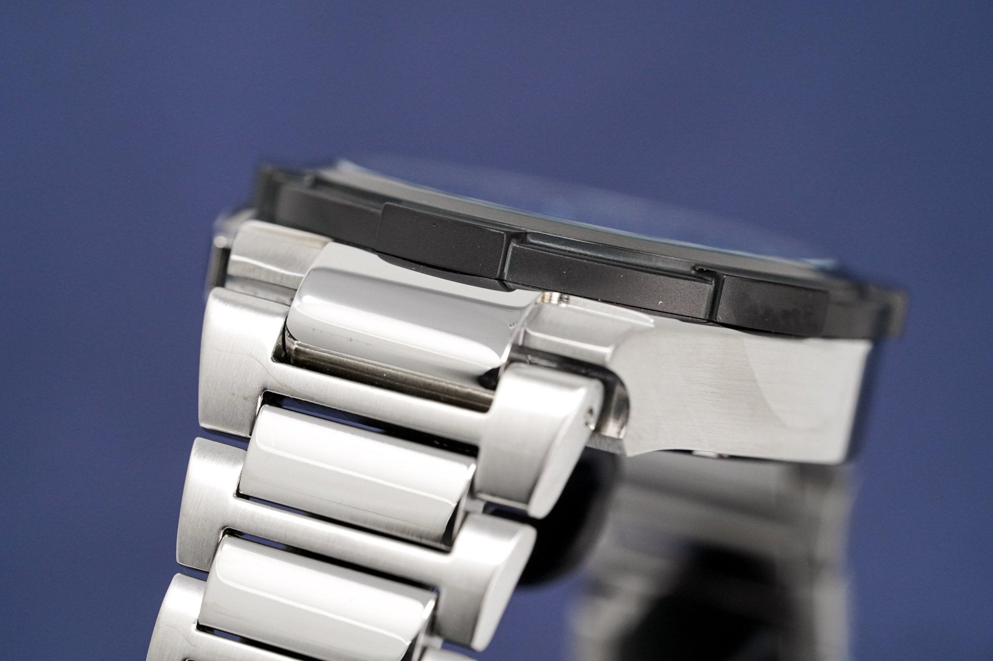 Blue Guillochè Dial. Stainless Steel Hands. Stainless Steel Stick Indexes. Date Window at 4:30.