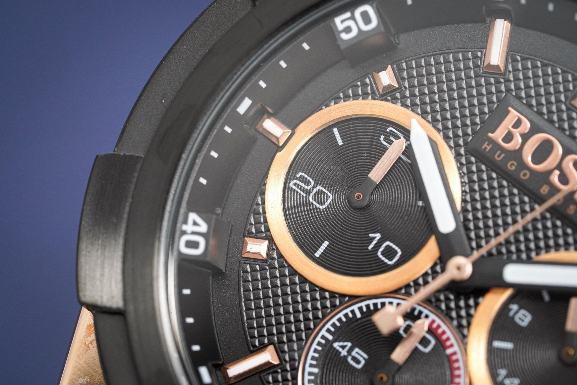 Guillochè Dial. Stainless Steel Hands. Rose Gold PVD Stainless Steel Stick Indexes. Date Window at 4:30.