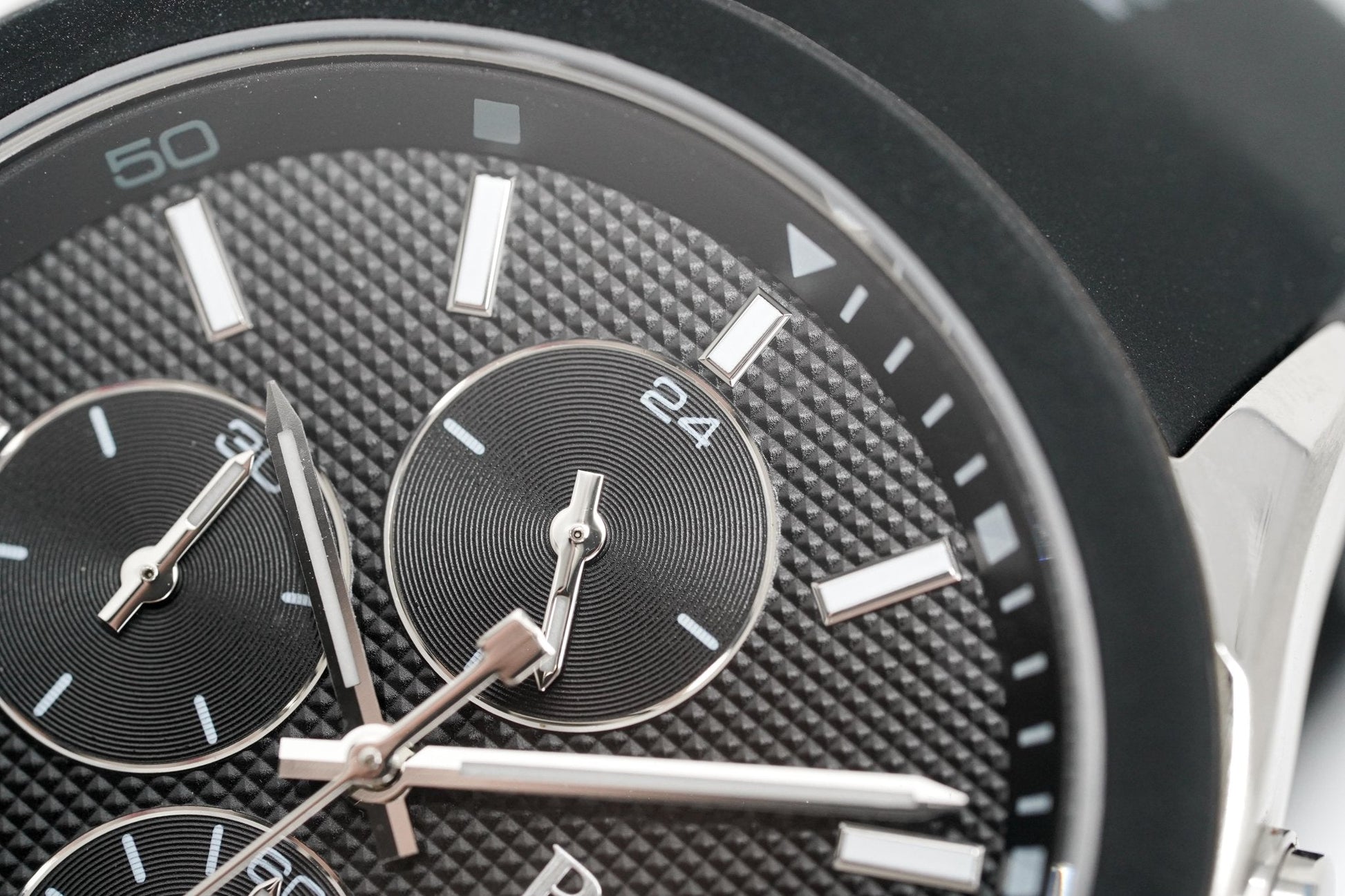 Black Motif Dial. Luminous Steel Hands. Stainless Steel Hands. Date Window at 4:30.