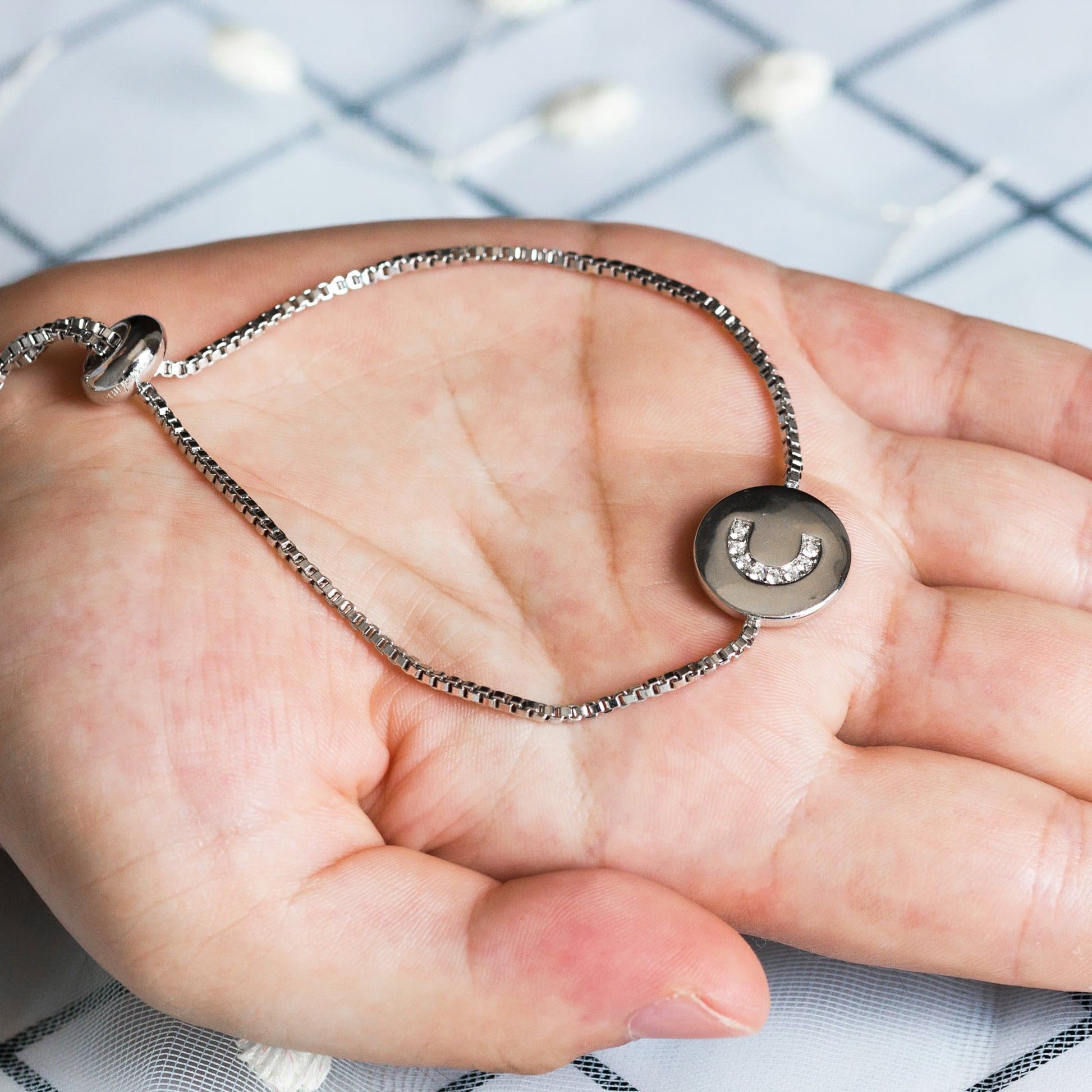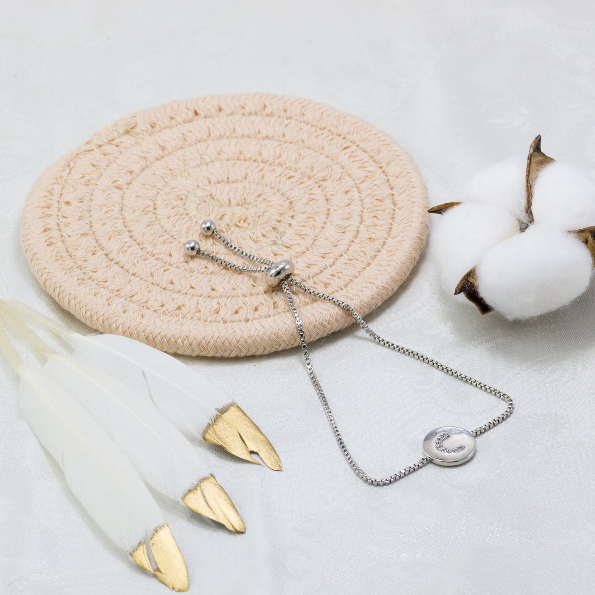 This Initial Friendship Bracelet Letter C was created with Zircondia® Crystals and features a silver-plated brass alloy construction. It is adjustable between 12cm and 24cm in length, with a circle dimension of 14.8mm (H) x 14.8mm (W). It features a slider closure and weighs 8.1g. The stones are available in two shapes and sizes: Round, 1mm with 8 Clear Crystals, and Round, 1.5mm with 1 Clear Crystal.